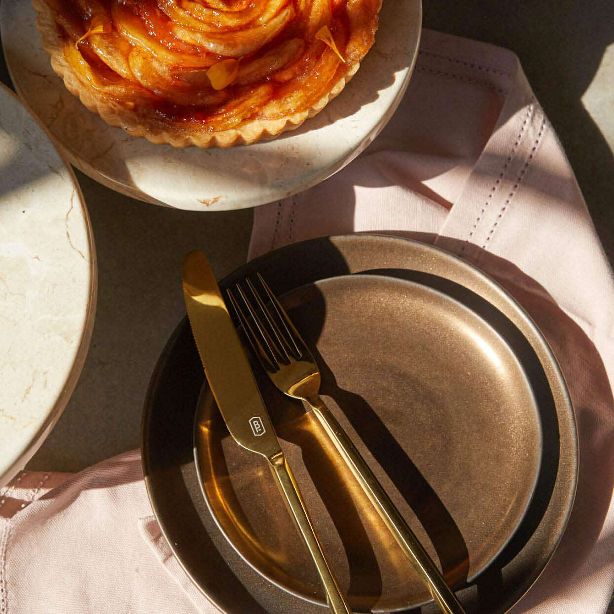 This stoneware collection adds a little drama to your tabletop with an Antiqued Gold glaze and soft rounded silhouettes. The handmade shapes, clay and reactive glazes give each Jacqueline piece an heirloom quality. The ideal dinnerware for fresh farm-to-table meals shared with family and friends. This reactive glaze makes each piece unique.