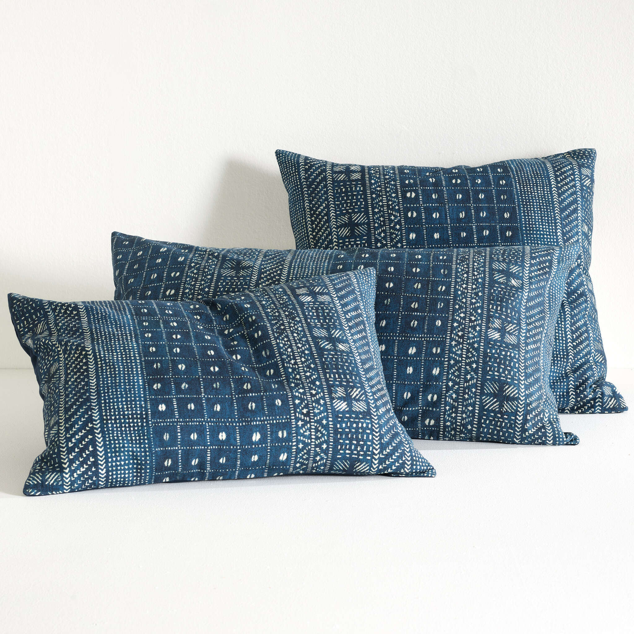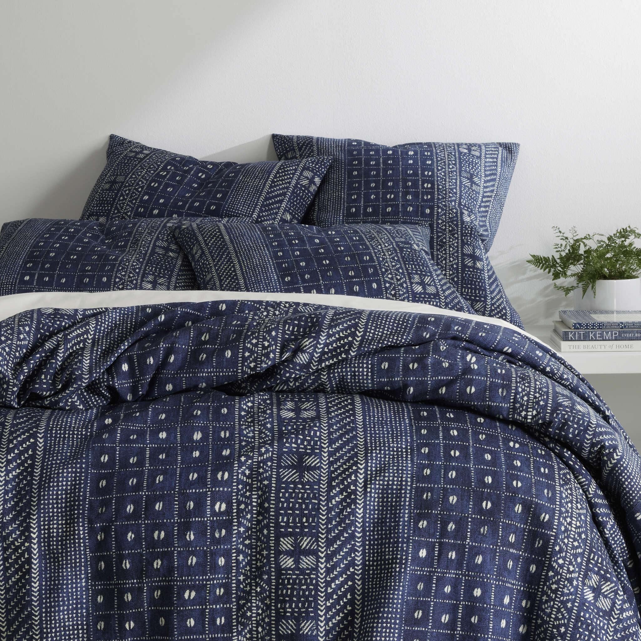 This eye-catching block print pattern was inspired by an antique textile our designers discovered at the famed Brimfield Antique Market in Massachusetts. Artful and eye-catching in an authentic indigo blue, it's made from a softly textured, cotton-linen blend and is single-sided with a solid navy reverse.