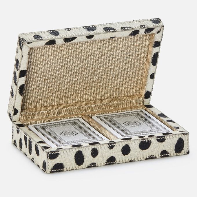 A must-have for people who take risks at the card table-and with style choices. More is more with our Lesten double deck boxes, especially in the playfully oversized option. Spirited hair-on-hide prints.