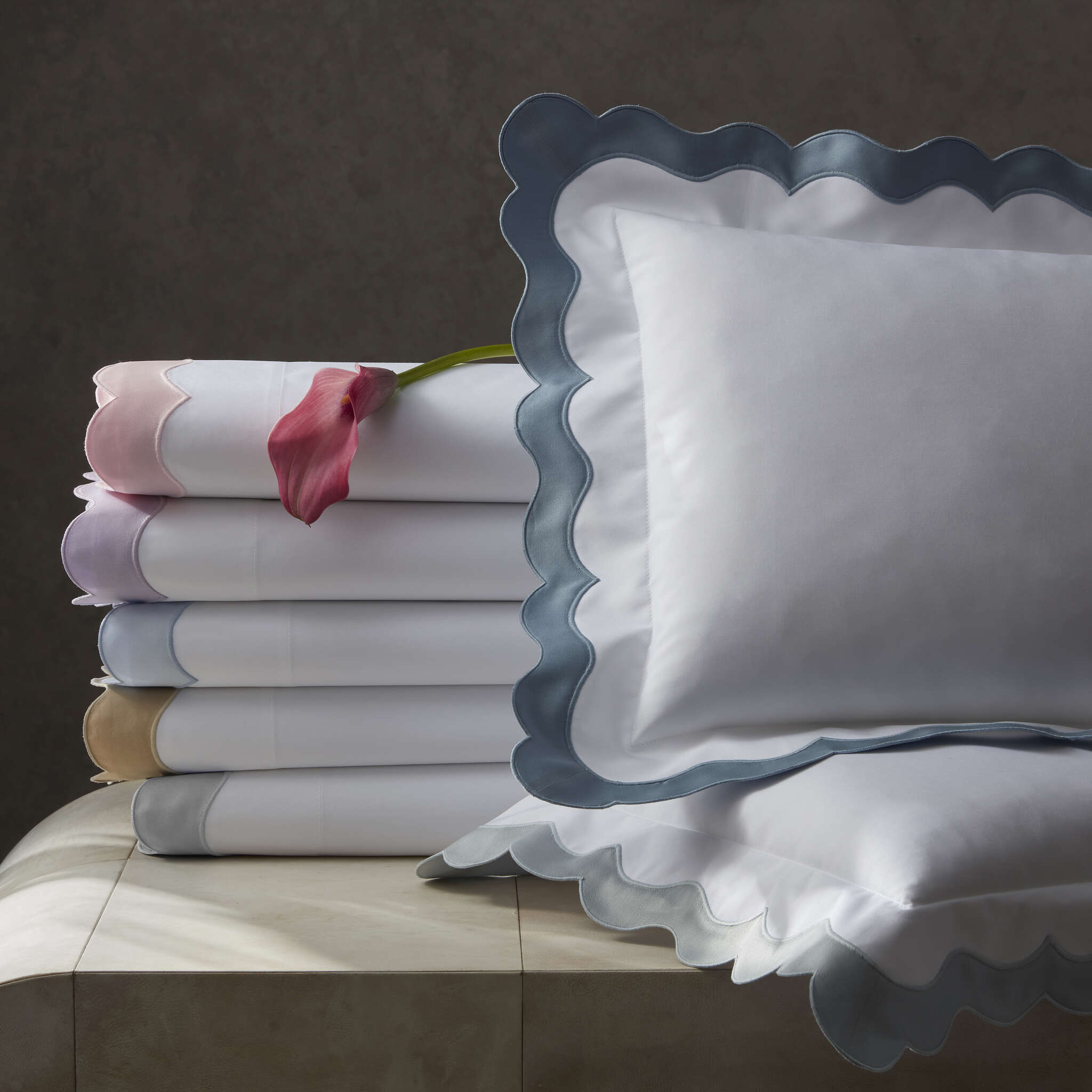 A unique and feminine appliqué scallop gives this style a wonderful artisanal look and a one-of-a-kind feel. Cast on our 600 thread count Milano Egyptian cotton percale base with sateen detail, the effect is modern femininity at its best.