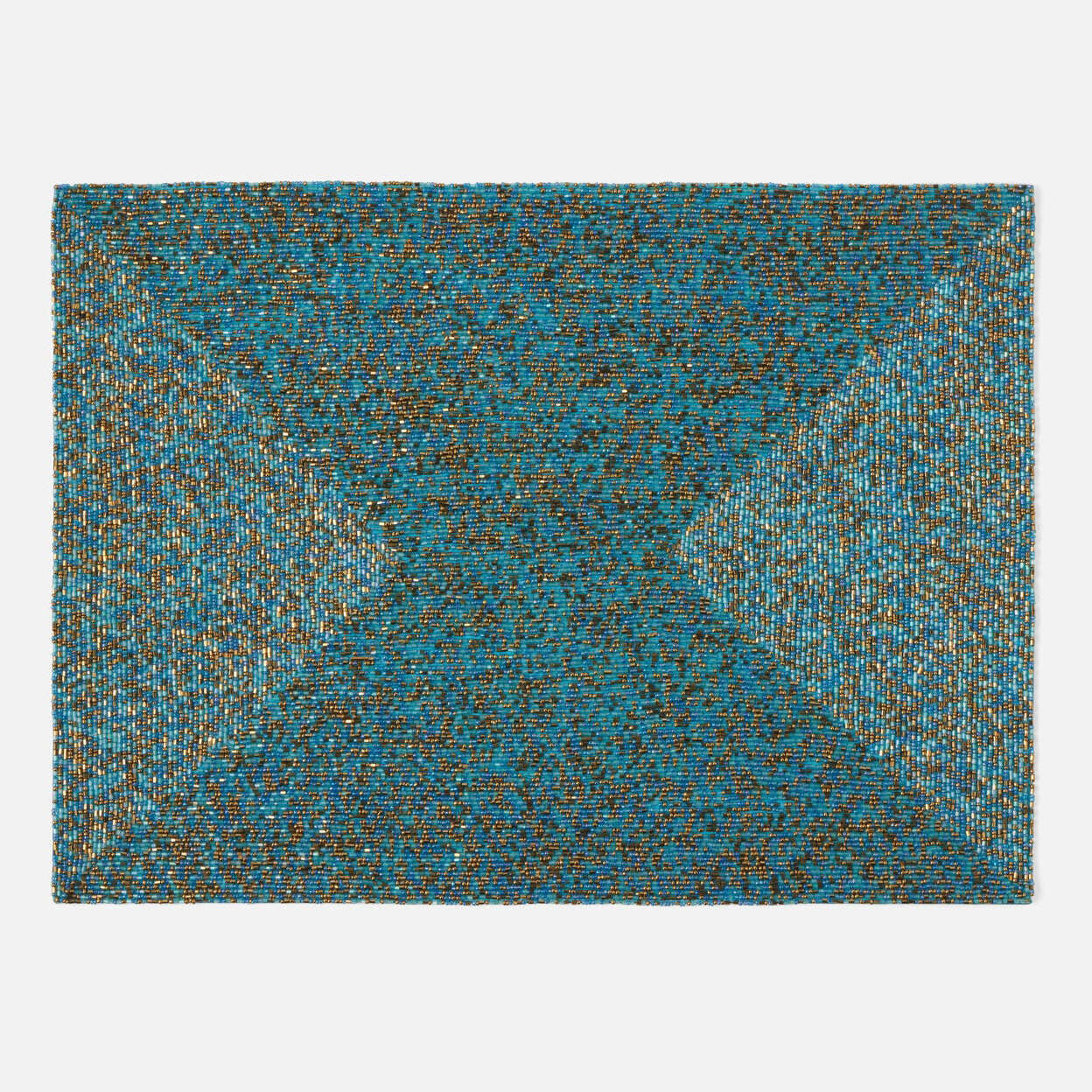 Made of coiled strands of thousands of glass beads, our Loretta placemat glitters in a turquoise and gold palette that recalls a desert sunset-for formal gatherings or special meals that require subtle sparkle.