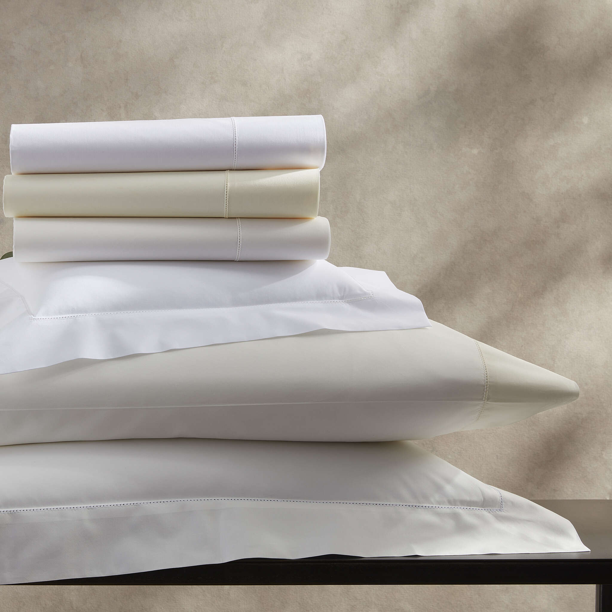 Super-soft 500 thread count Egyptian cotton percale sheeting, finely woven for a smooth touch, is adorned with a delicate hemstitch detail. In a versatile, flattering palette, Luca Hemstitch is the epitome of simple sophistication.
