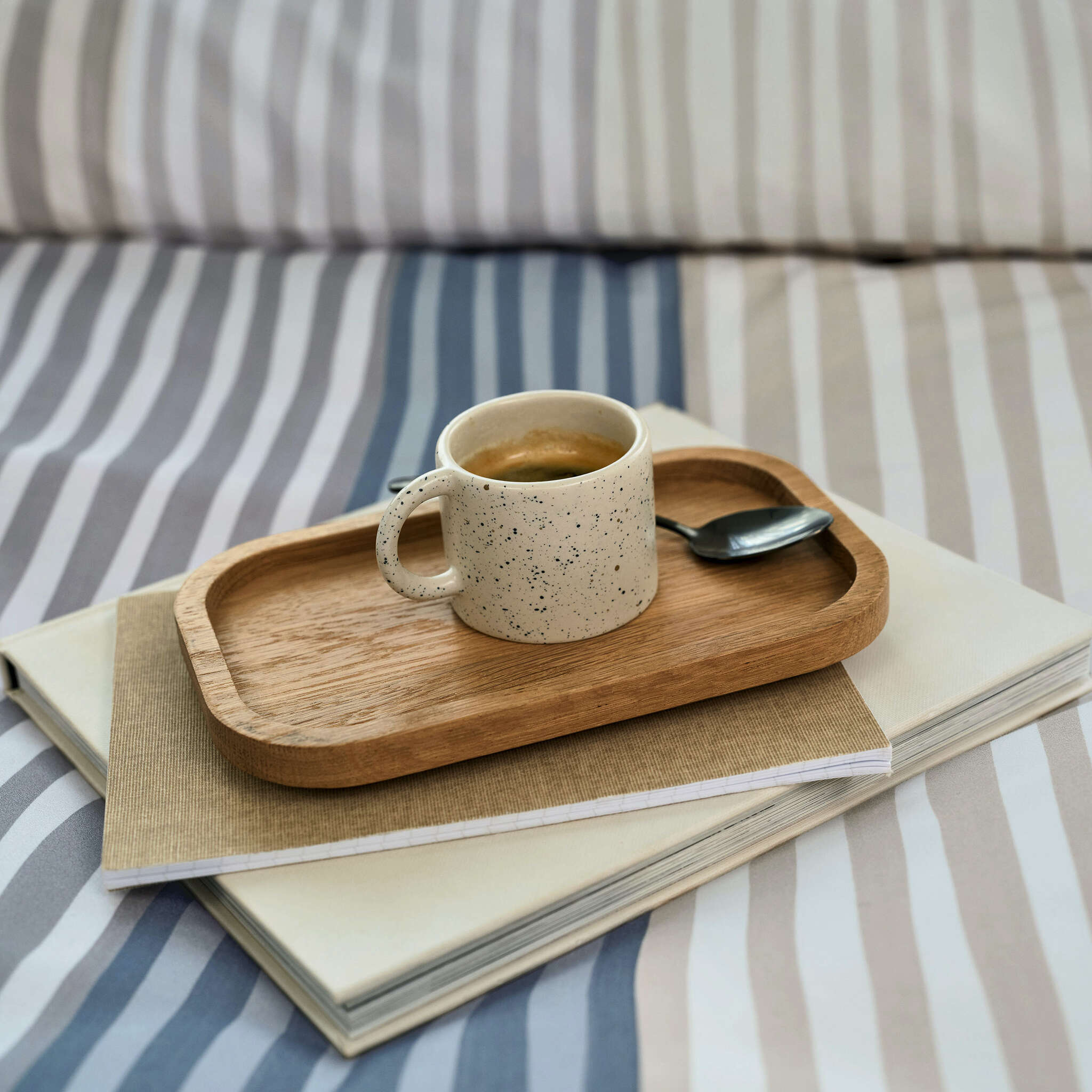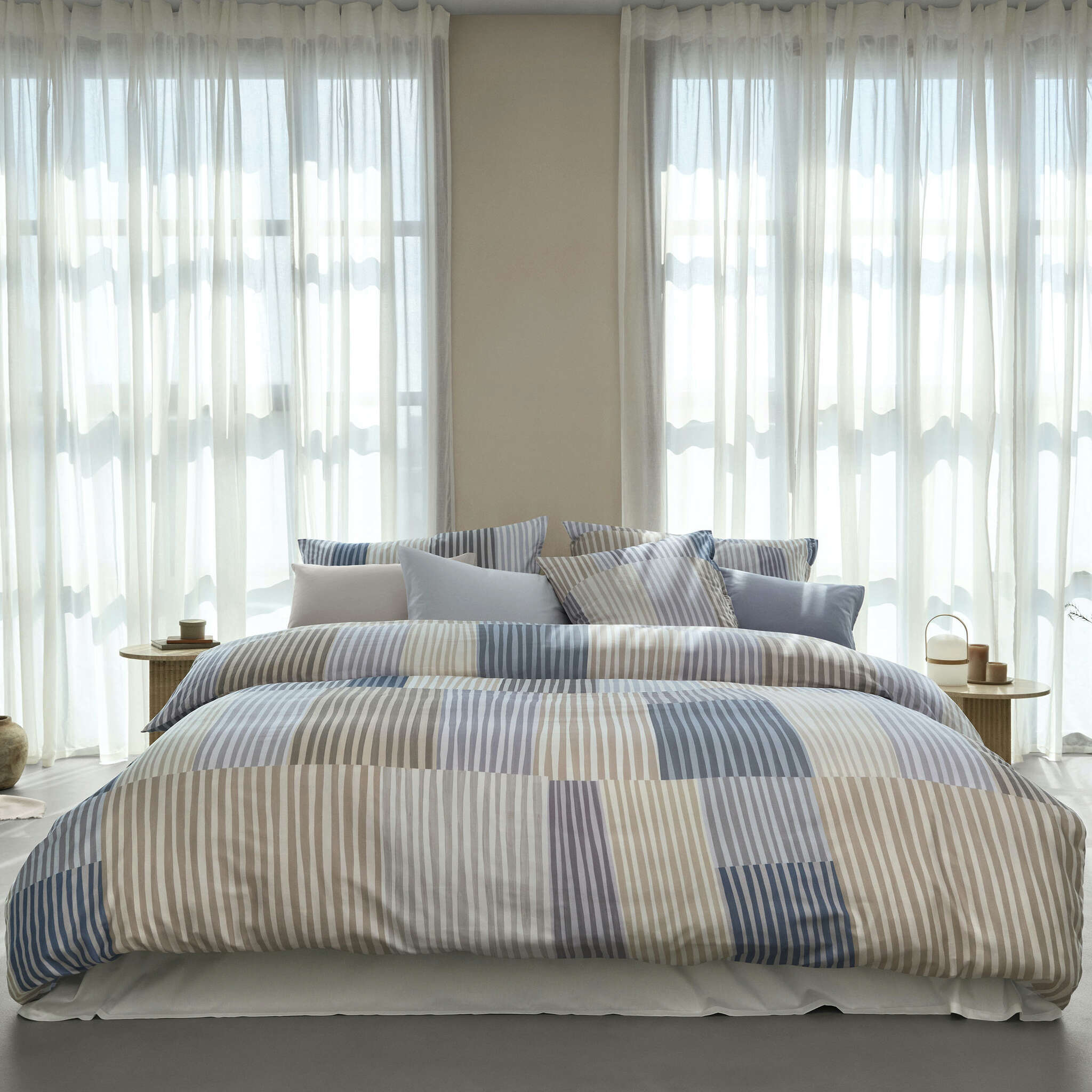 A graphic design that reinterprets classic stripes while remaining open to your individual interpretation – stripes painted with a thick brush and gouache paints line up on the MELVIN bed linen, forming large areas in different sizes and swinging in their very own rhythm. Lively sections alternate in light and dark color compositions rich in contrast, merging into a light, beige version as well as a multicolored, bright version.