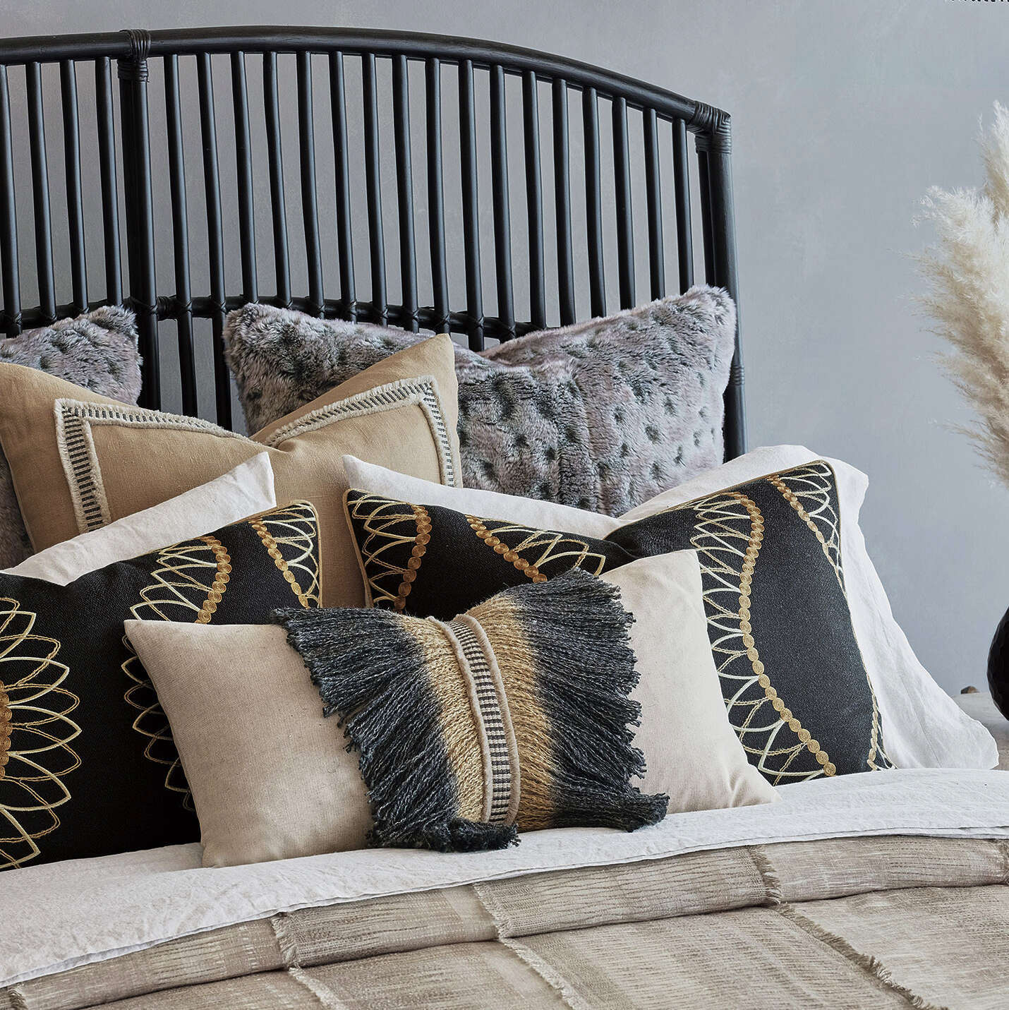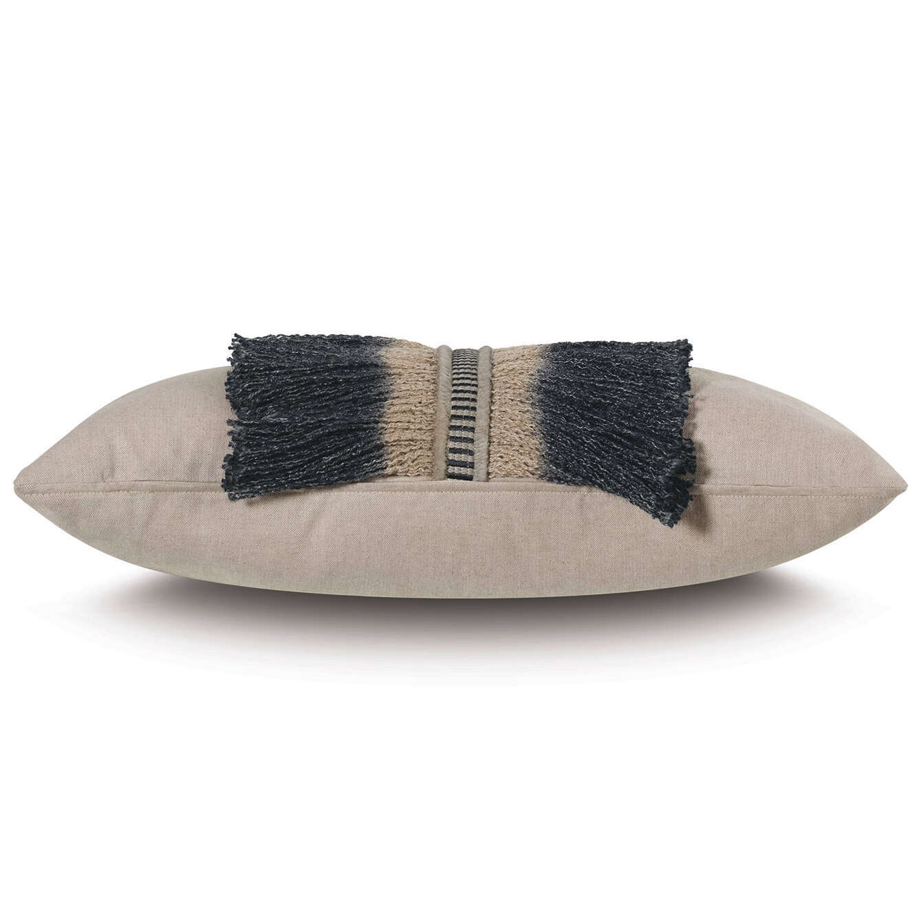 Decorative pillow: bullion fringe and border over a beige fabric face. Self-backed in Greer Linen. Knife edge finish.