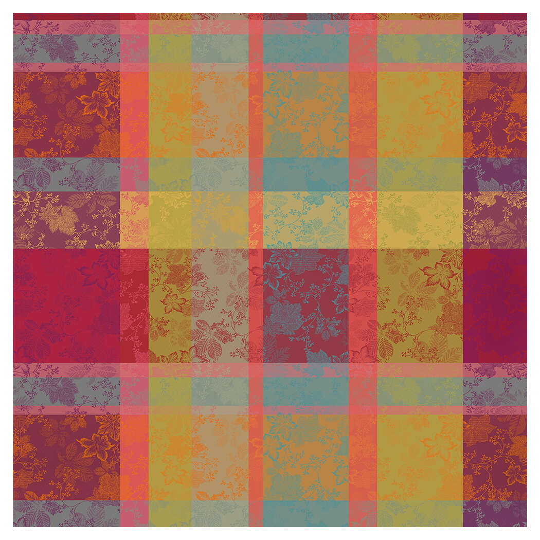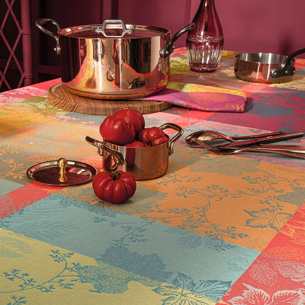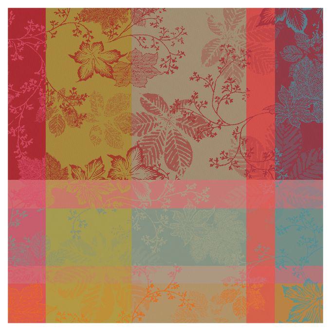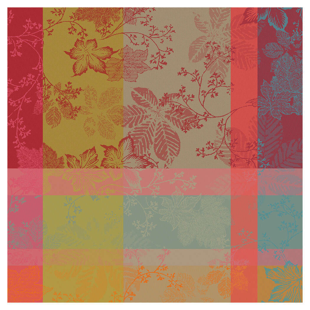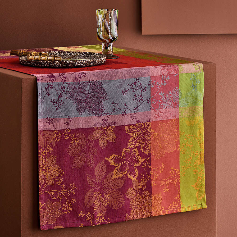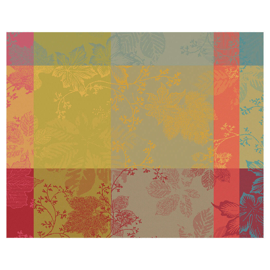 The jewel-tone leaves in red, purple, and green on the 100% cotton Mille Sous Bois Automne Tablecloth help make your table the centerpiece this fall. This woven design was crafted from original artwork, hand-drawn by our in-house team of textile artisans & designers in France. Constructed on jacquard looms with extra long staple cotton, Garnier Thiebaut USA's jacquard table linen collections are woven for longevity, and can last for generations with the proper washing maintenance and use. Enhance your gatherings with the Mille Sous Bois Automne Tablecloth, woven to bring the beauty of nature indoors and ensure lasting durability for generations.