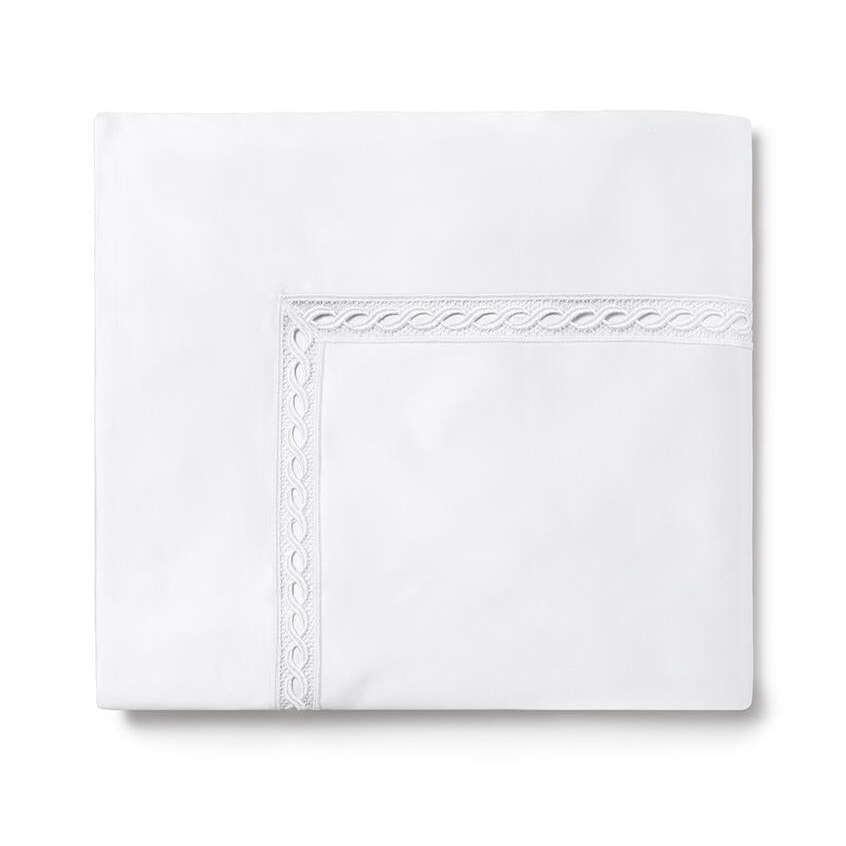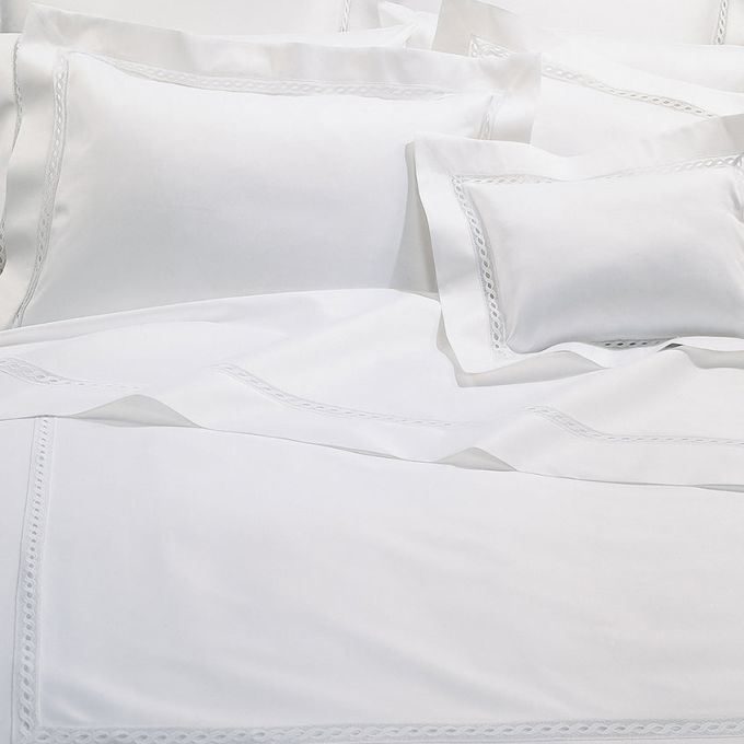 Fabrication: Sateen with Italian-made lace inset: Duvet Cover: U-Shape on top of bed and at flange, Shams: 4-sides, Flat Sheet and Pillowcases: Along return and cuff.