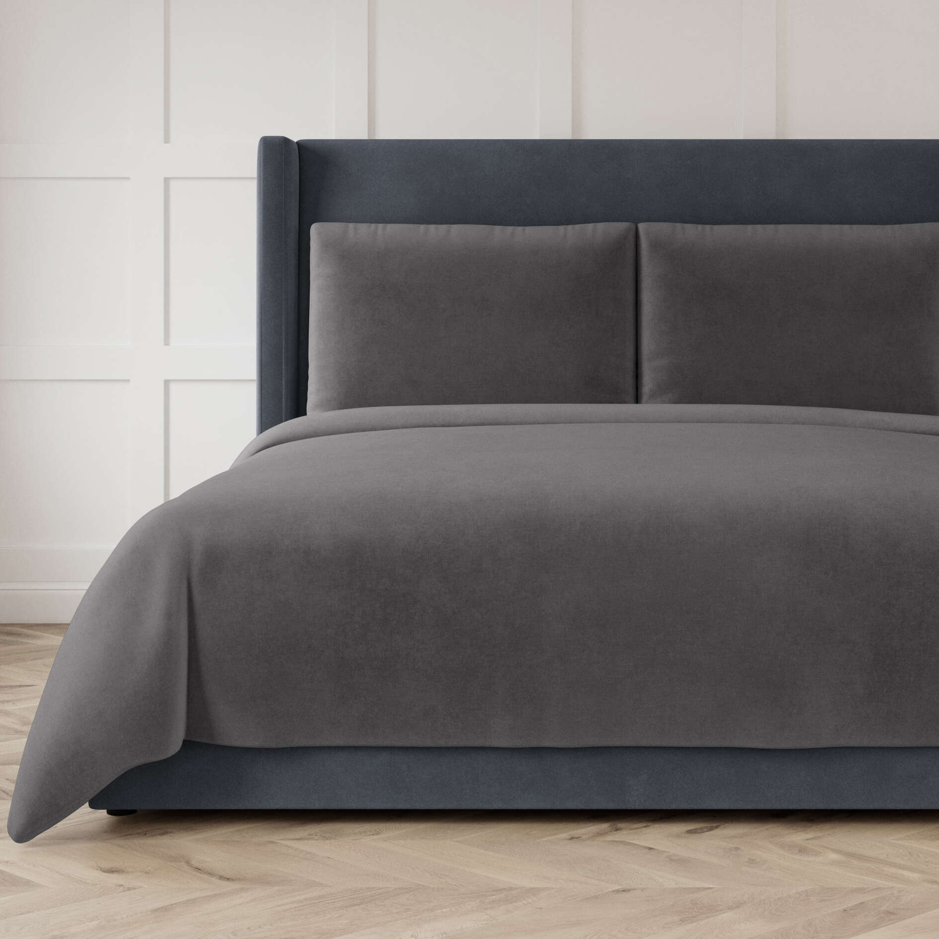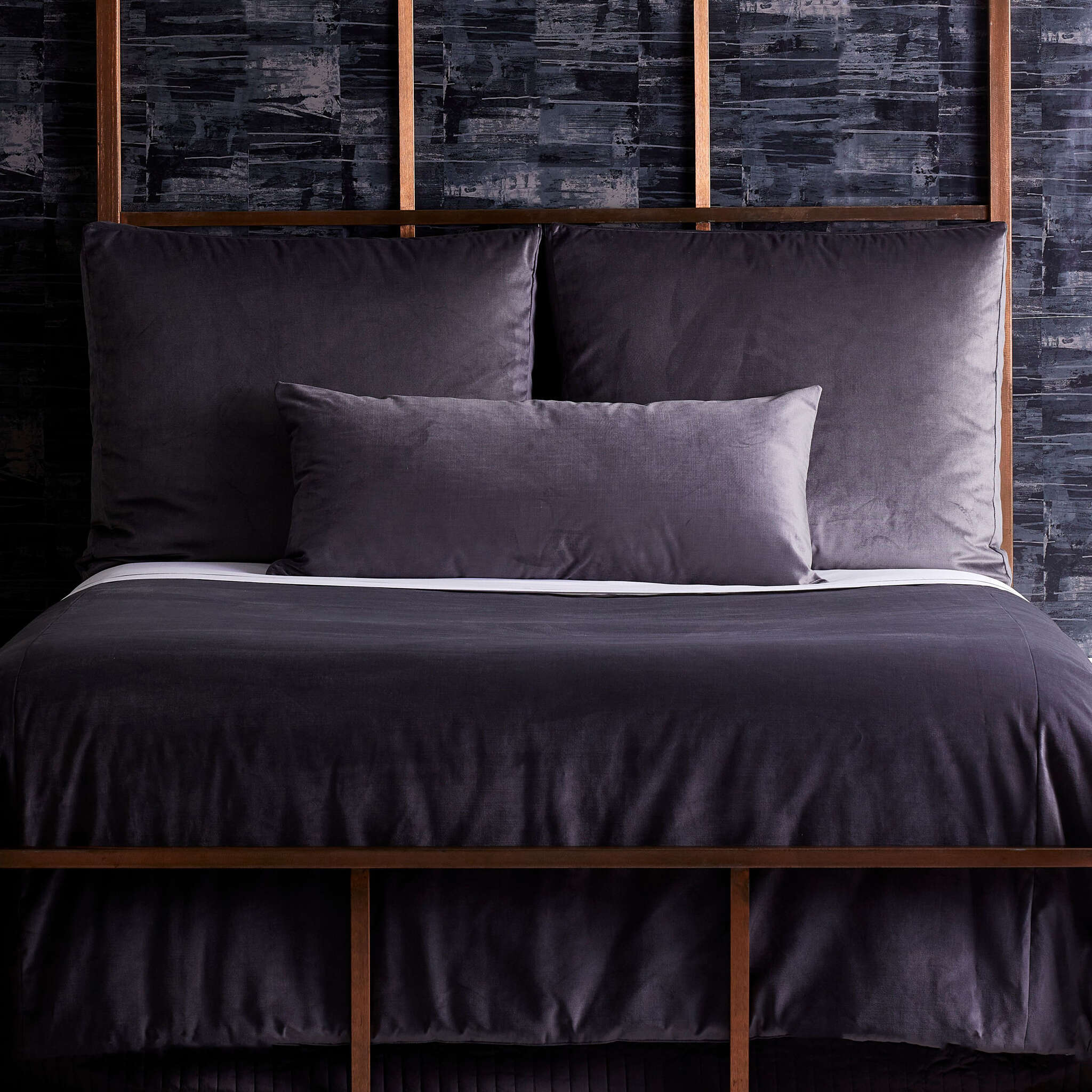 Modern Velvet takes a hatched weave of velvet and elevates it into a modern look. Box pillows and padded coverlets add a perfect touch to any bed.