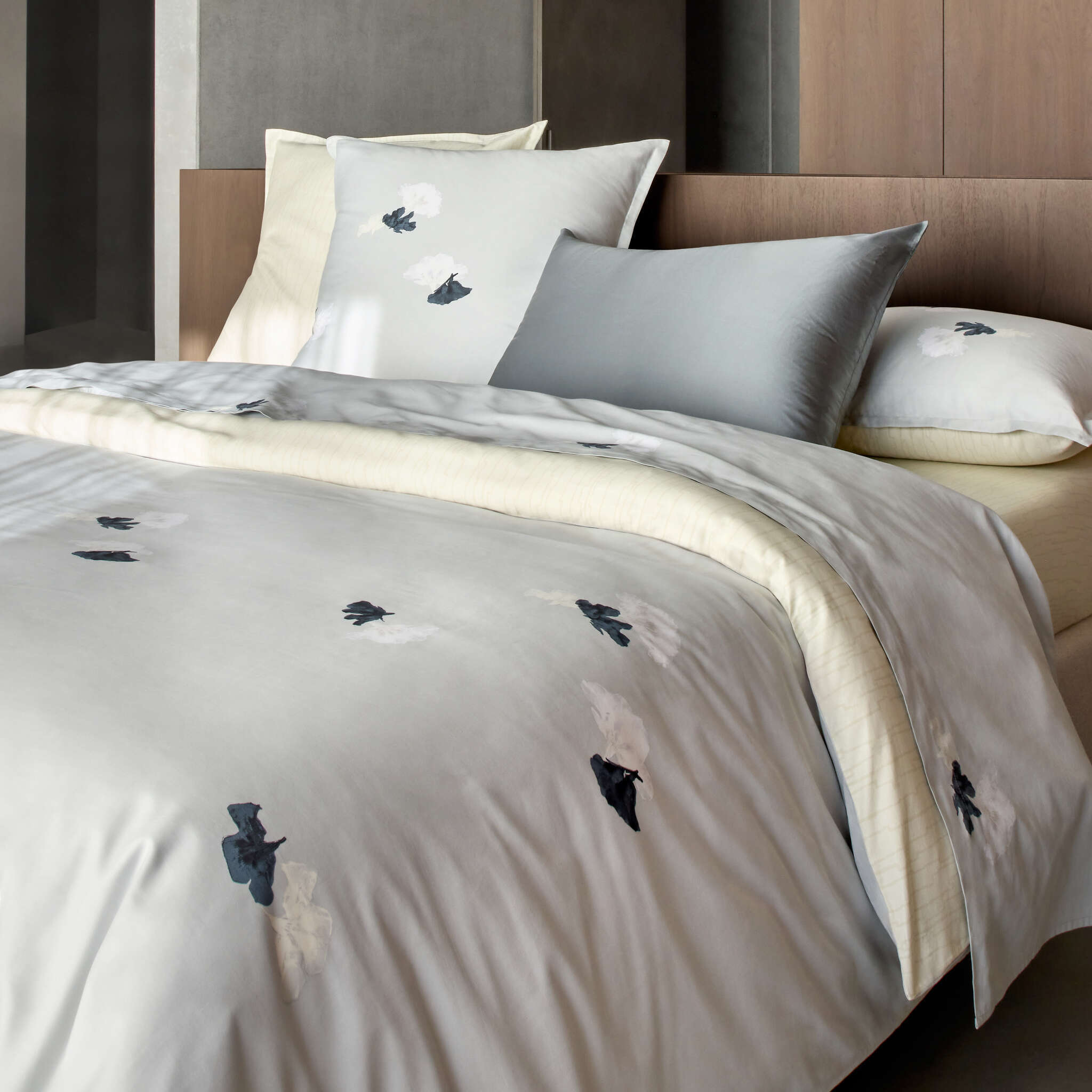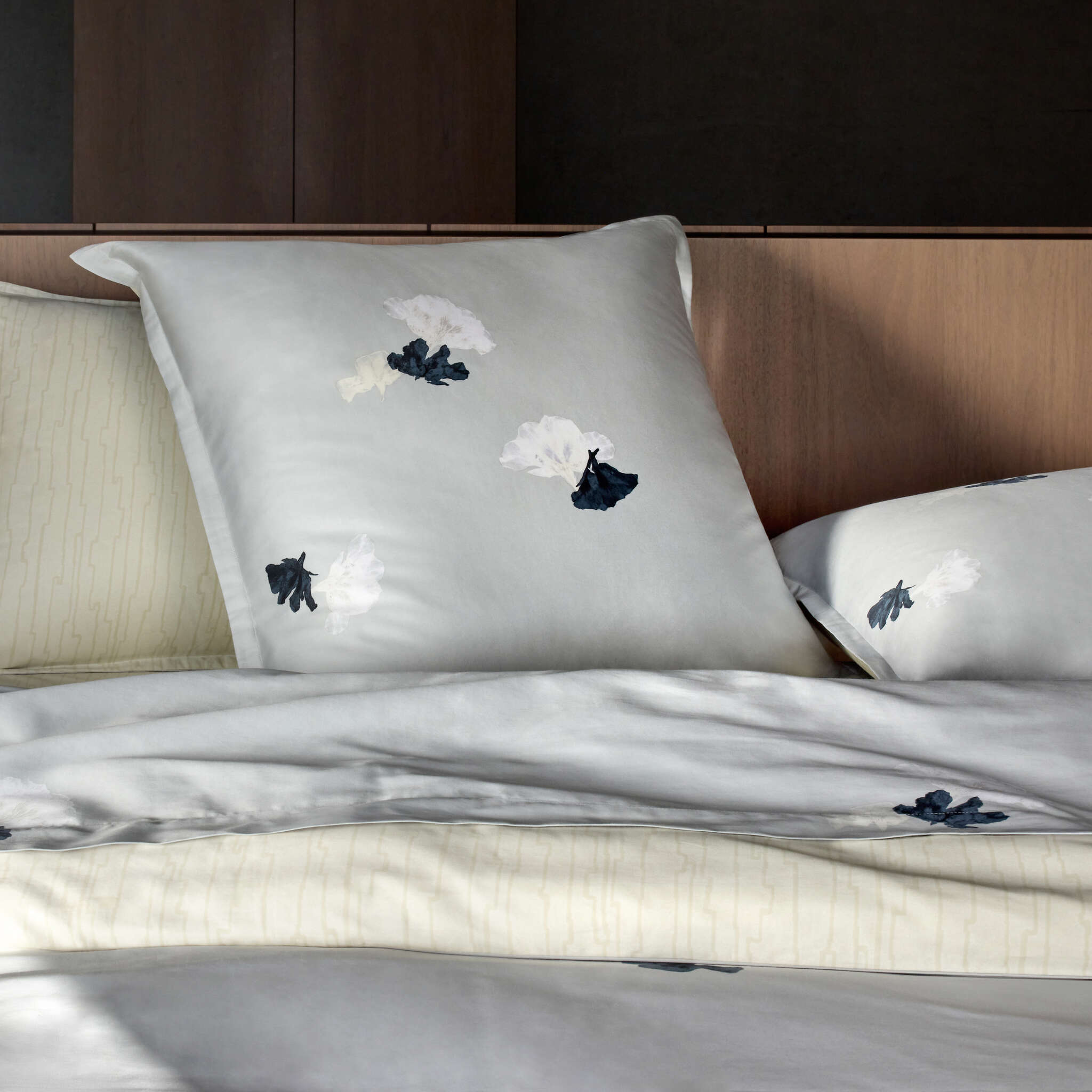 Let your bedroom bloom with the Moon Flowers bed linen collection by BOSS Home. A serene, modern take on floral design, diaphanous abstract petals are scattered across a silver-grey cotton sateen background like a lunar meadow. Crafted on silky smooth cotton sateen, this a collection that calms and restores.