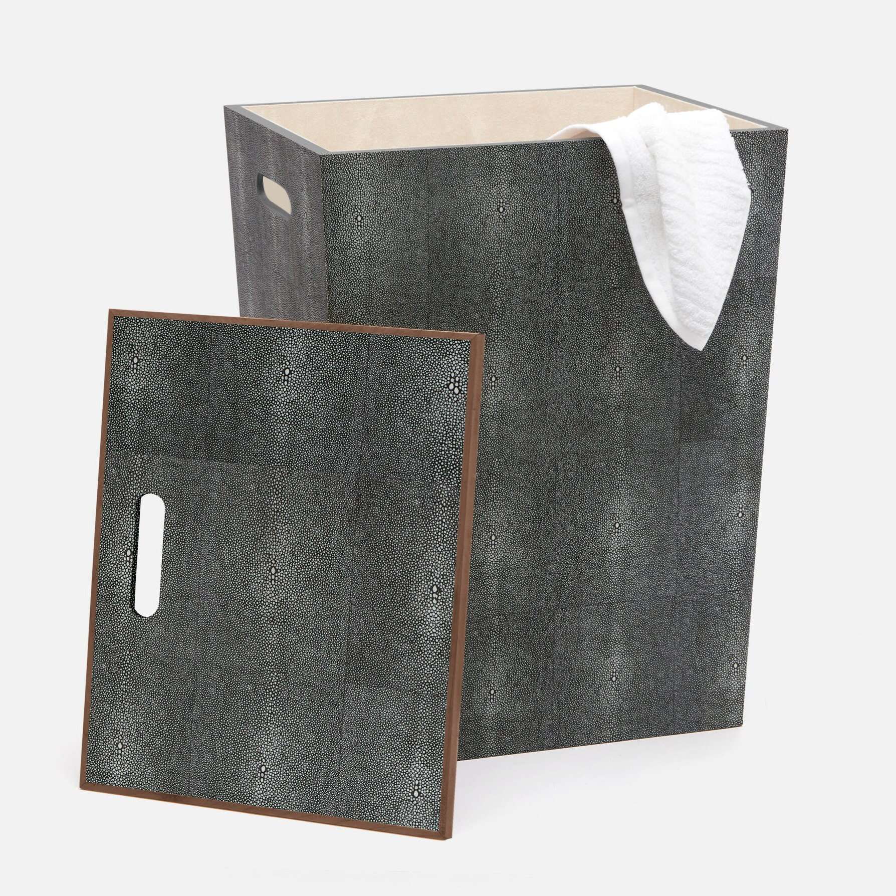 Our Northwich makes luxury and storage synonymous thanks to the hamper's full faux shagreen finish. A thin veneer trim simply highlights the material's stunning pattern, and top and side-facing cutouts prevent ease of movement from marring its exquisite silhouette. Perfect for a bedroom, guest room, bath, or laundry.