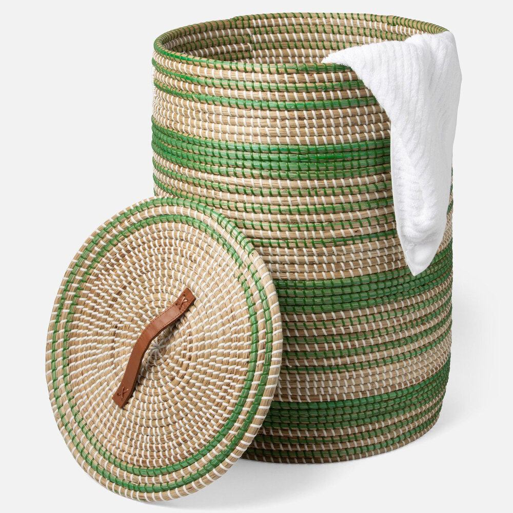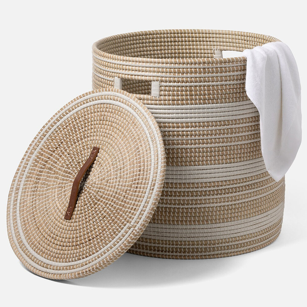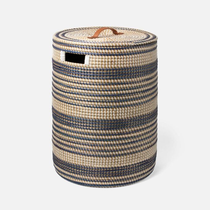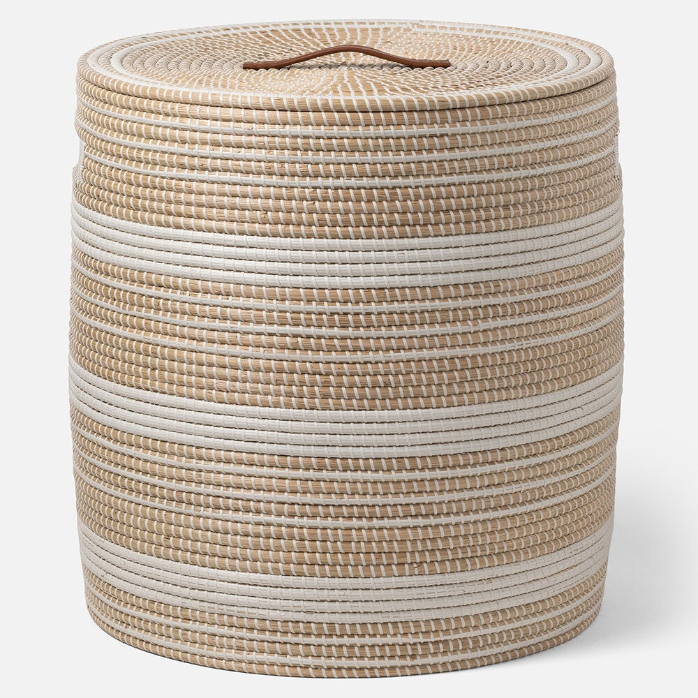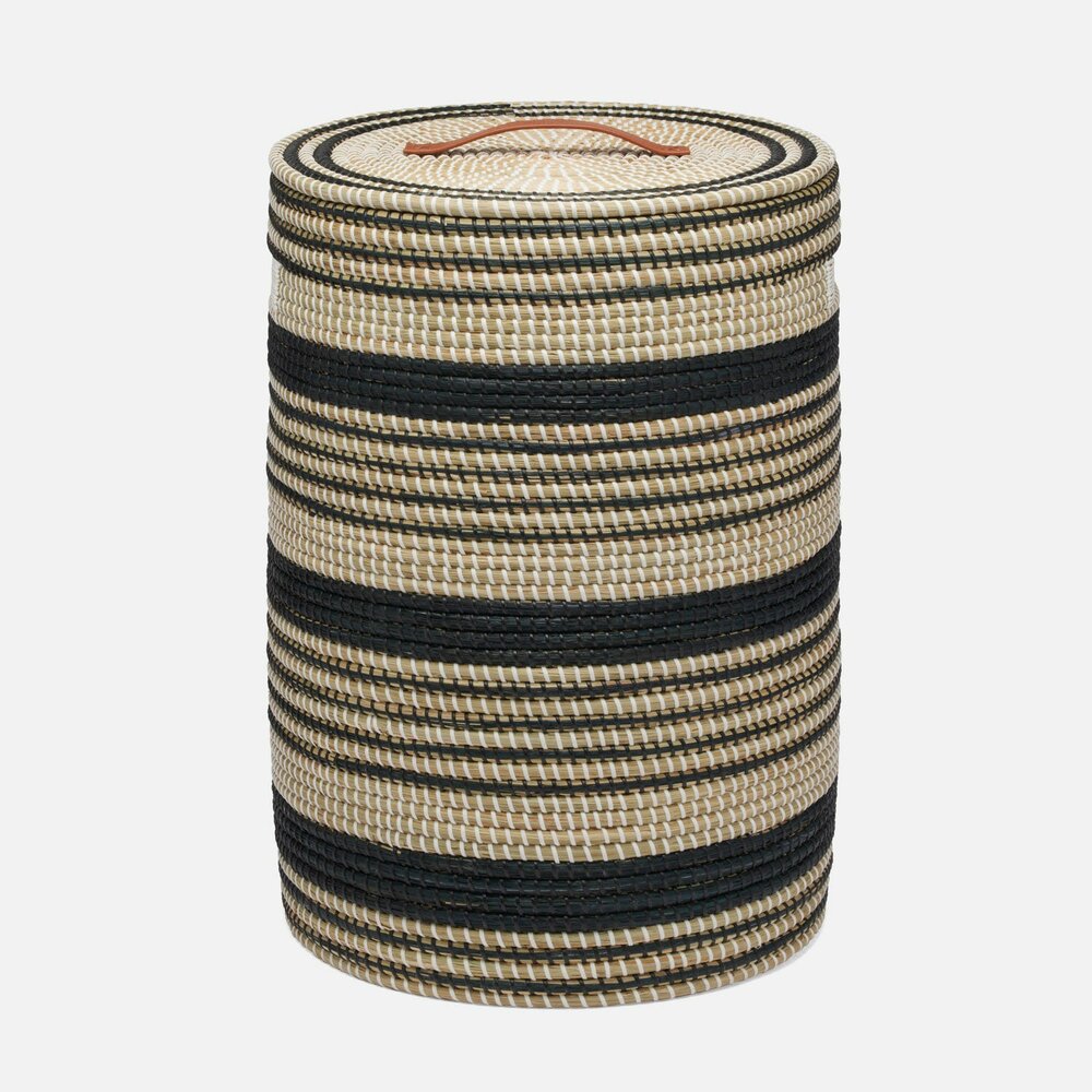Woven seagrass in a multi-stripe, two-color pattern. Detachable lid with leather handle.