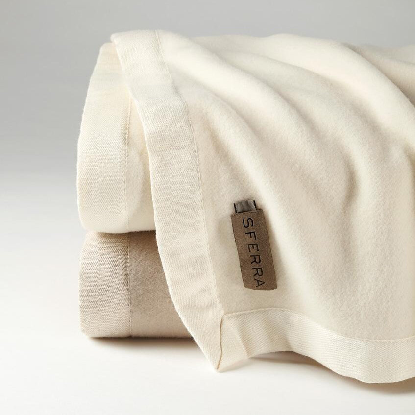 Olindo is woven from the rarest and most extraordinary Merino lambswool in all of Australia, known for its supreme comfort and warmth. Its unique construction creates countless tiny air pockets within the fabric, and these little thermal bubbles form the secret to Olindo’s soft, spectacular warmth. Each generously sized Olindo blanket is finished with fabric-bound hems.