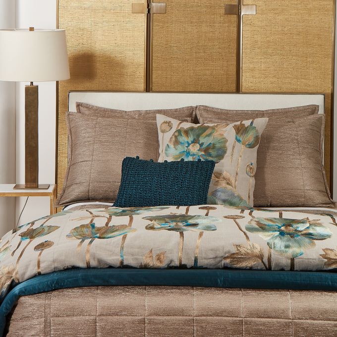 Named for the intoxicating poppy, the Opium collection features embroidered oversized flowers in teal, gold and blue on a natural linen ground. Complete the look with the matching duvet or throw, sold separately.