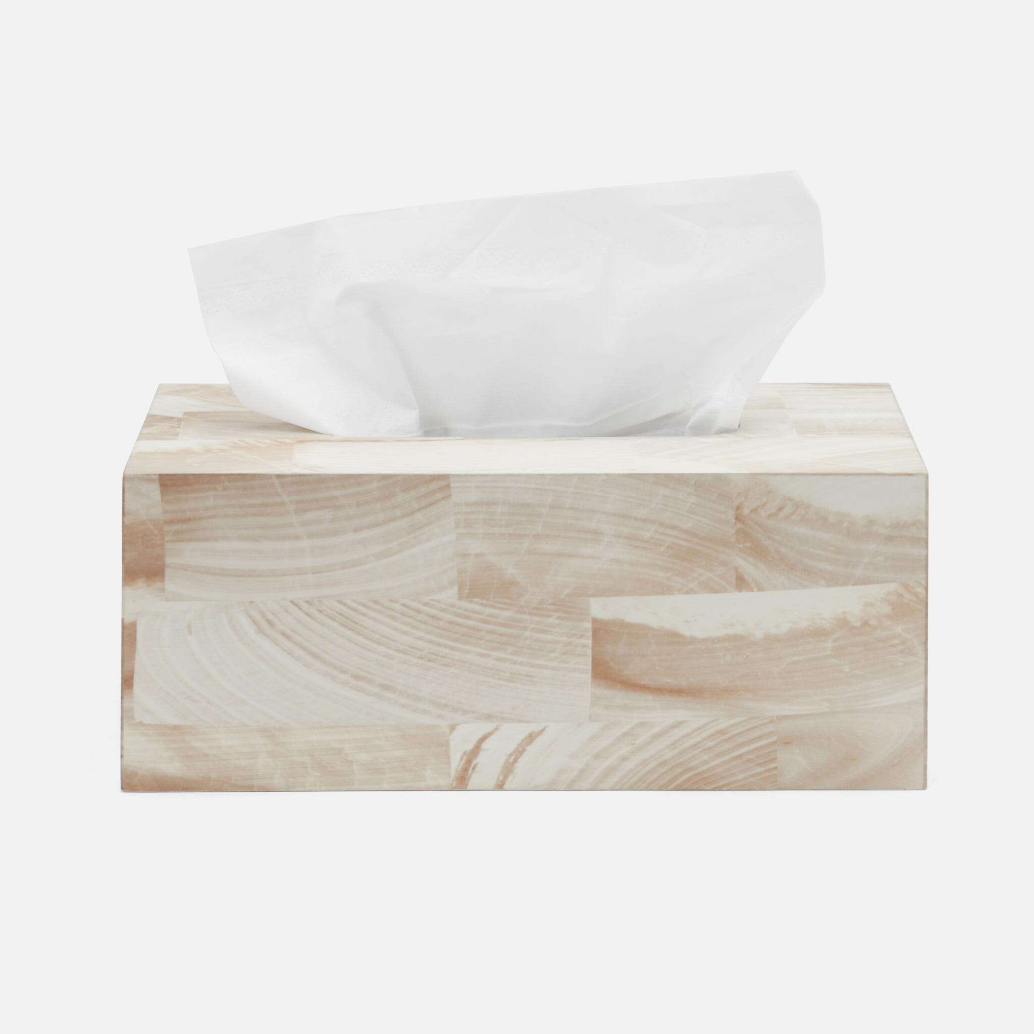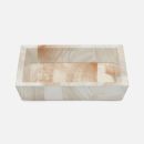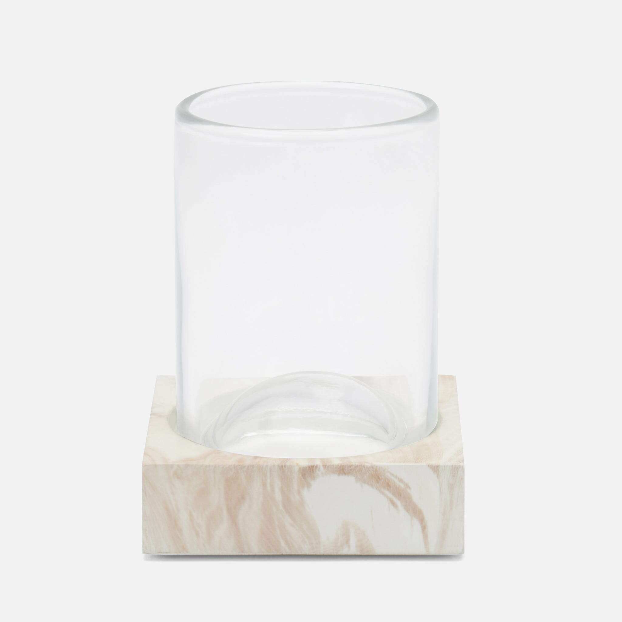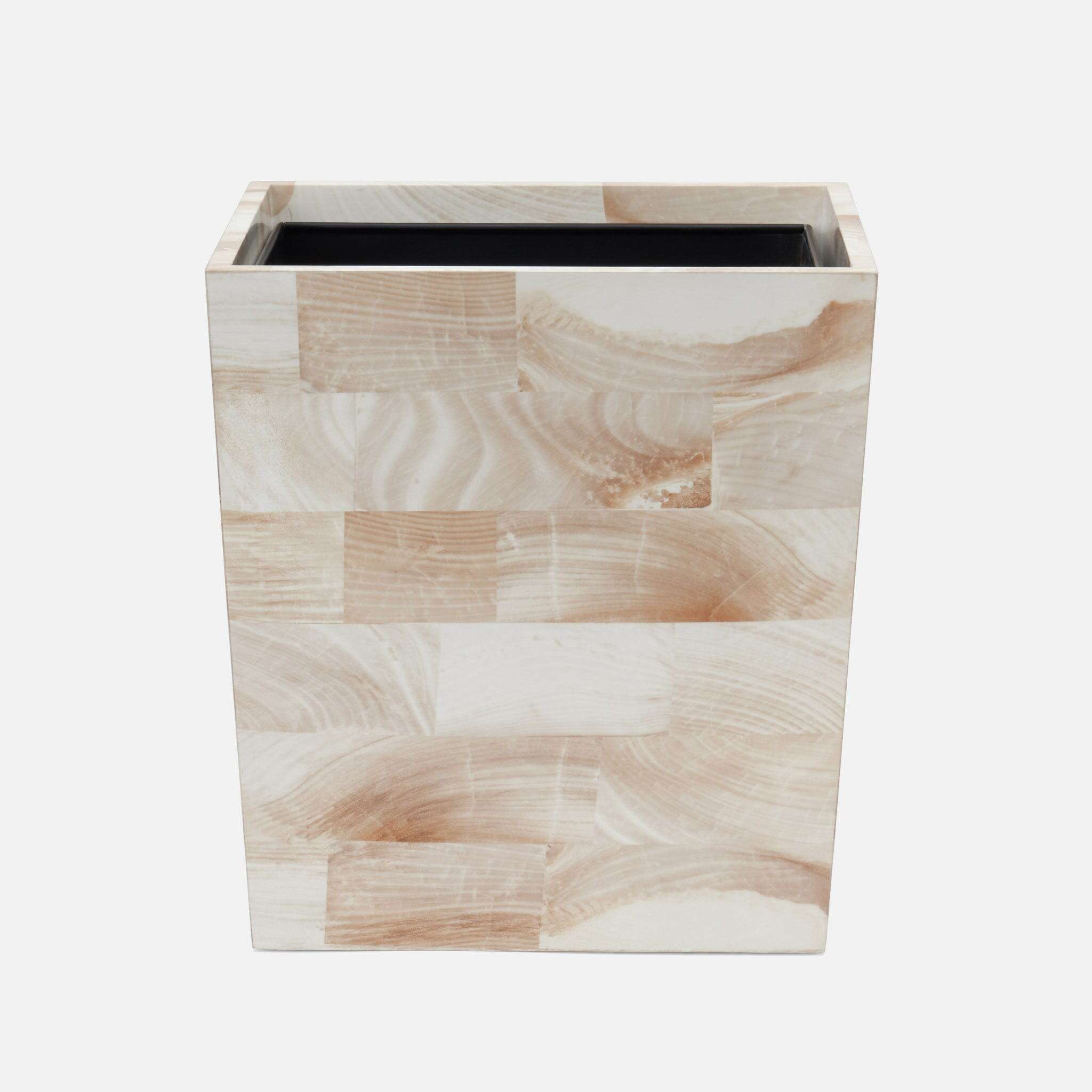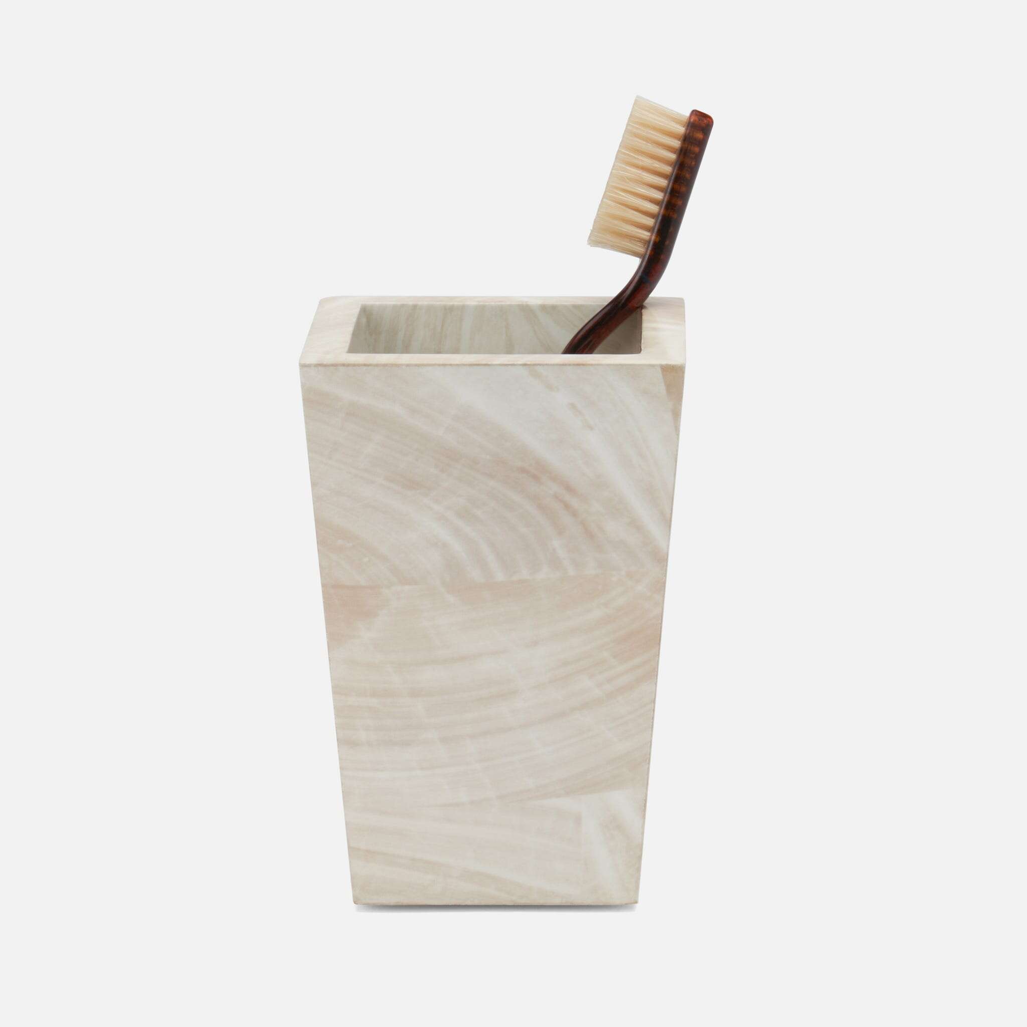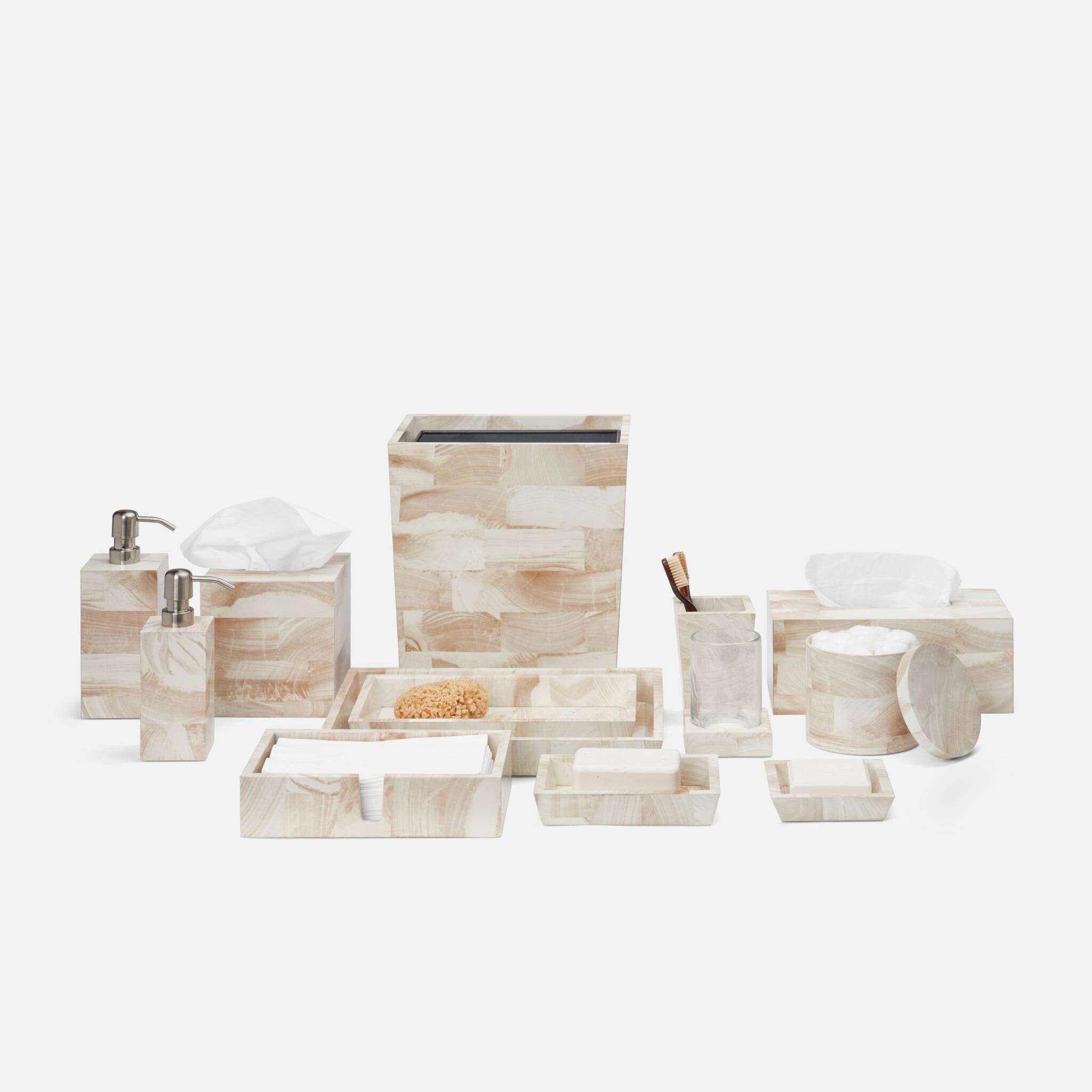 This handsome faux clamstone bath collection has a nuanced striation and a new brass trim.