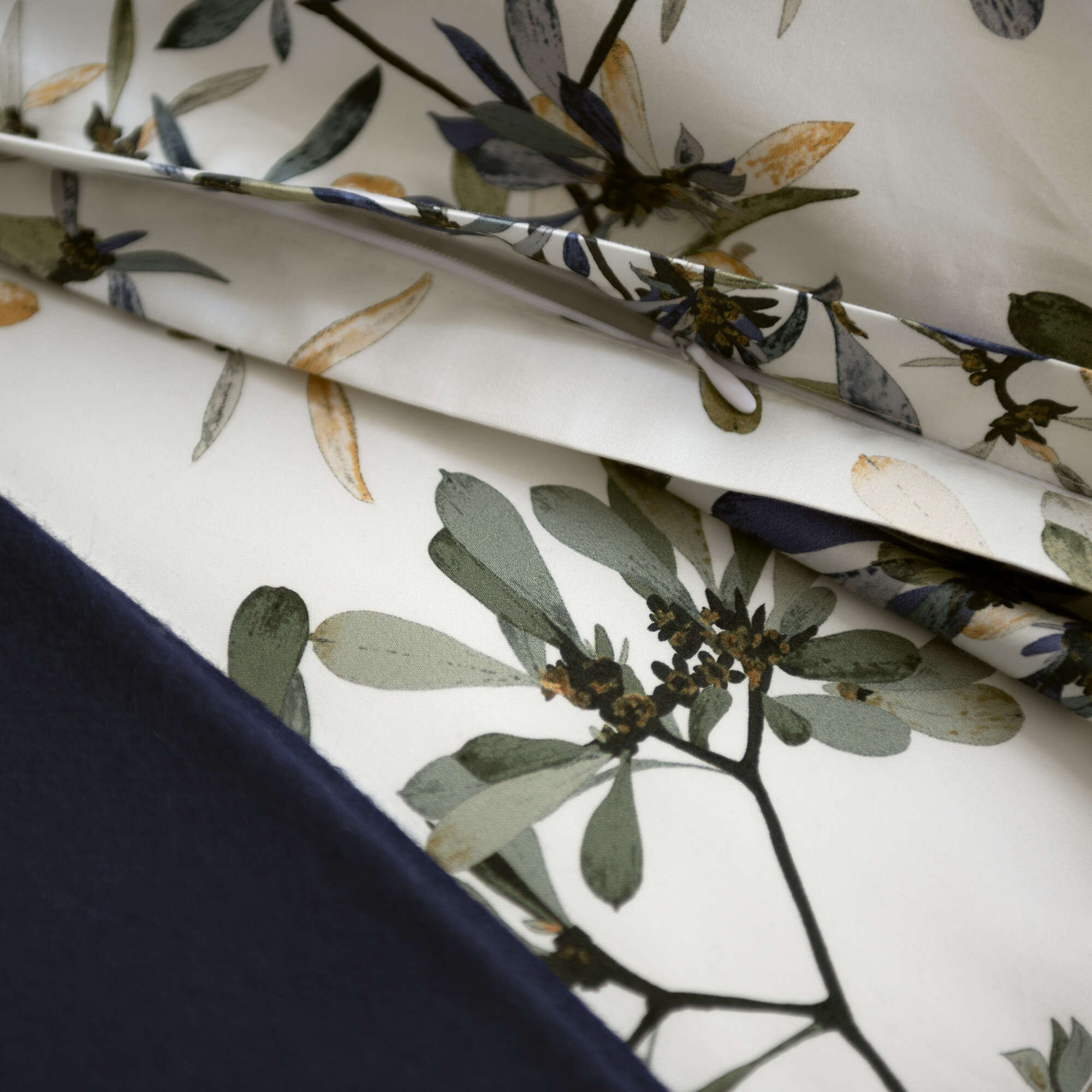 Pleasing botanicals in modern colour schemes. Paloma brings a contemporary floral landscape with vibrant indigo, hunter-greens, amber and pine hues - this floral print comes to life on its cloud background. Let your space bloom this season under watercolour branches of indigo, hunter-green and gold hues.