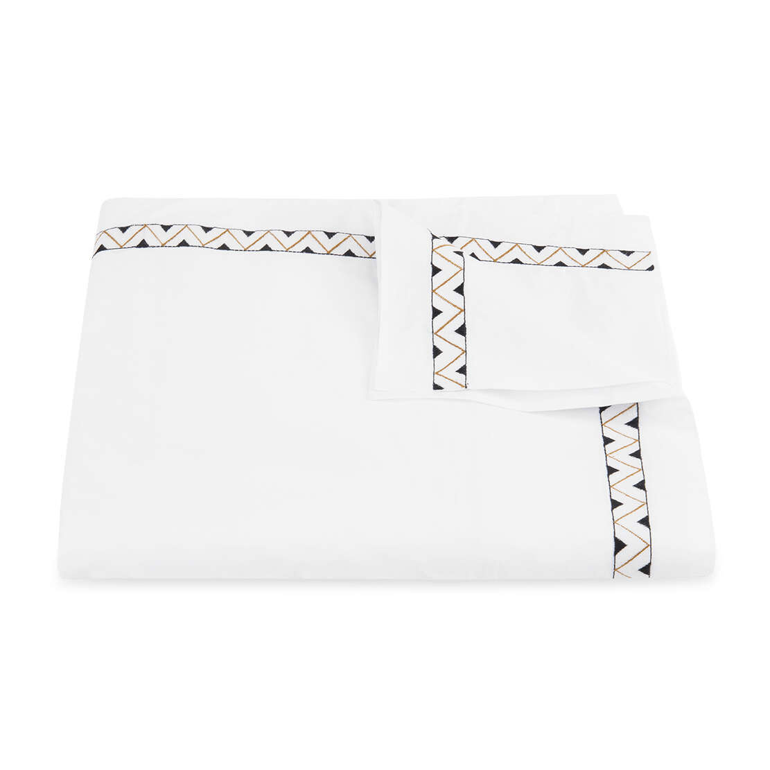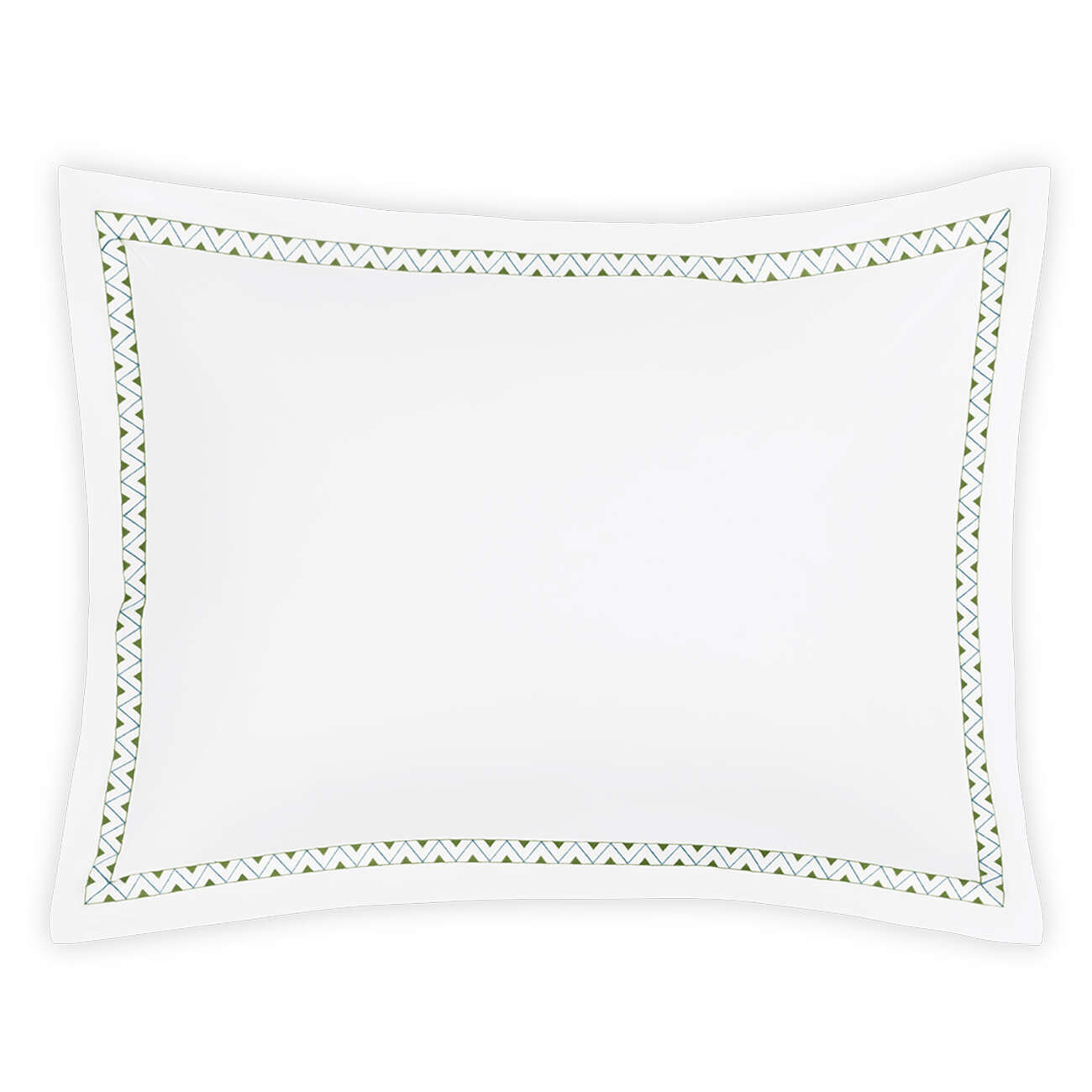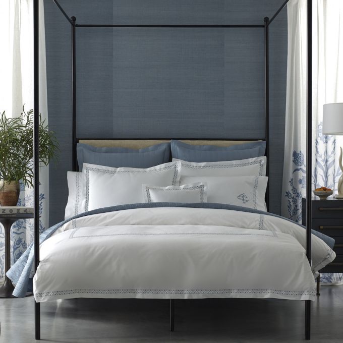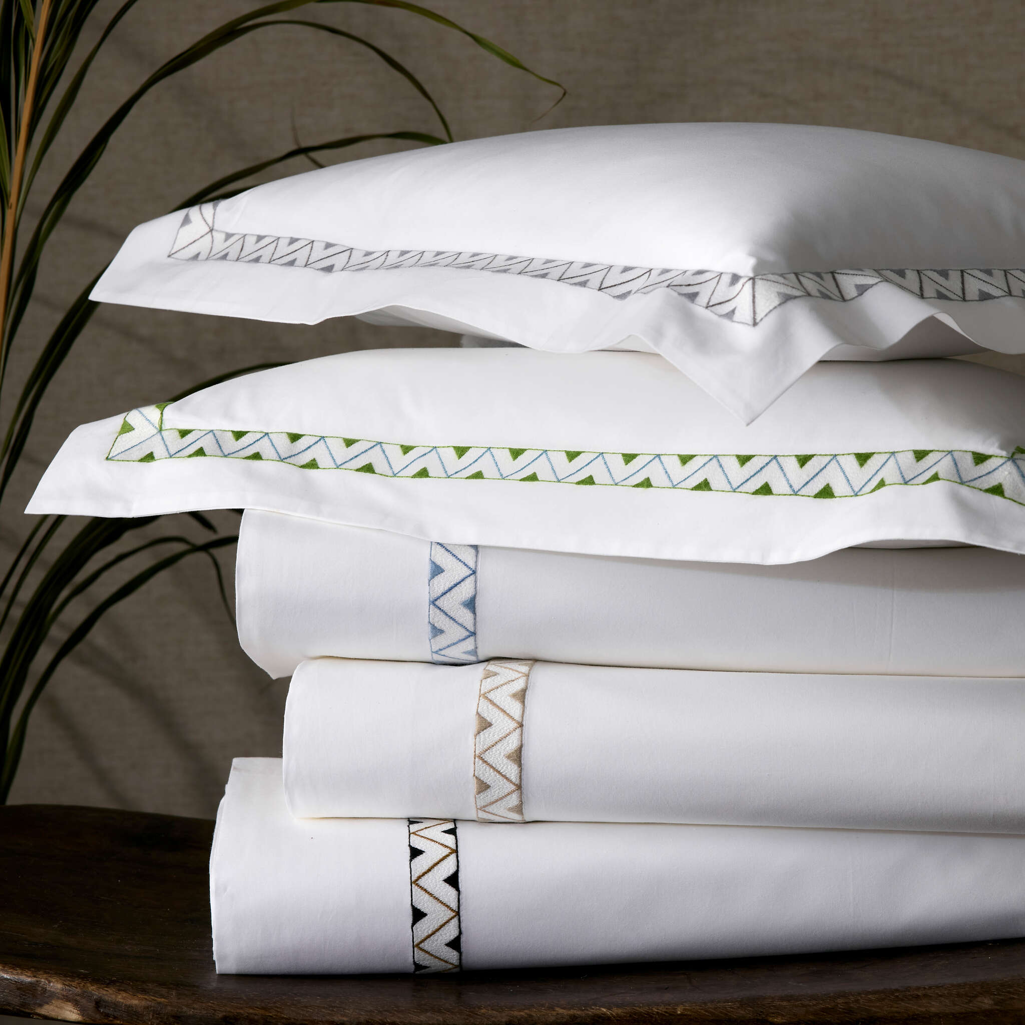 Prado creatively combines a chic Schumacher design and a classic Matouk construction, with breathtaking results. We’ve placed the Prado pattern on our crisp 520 thread count Ceylon percale as we would a tape detail, but here the pattern is fully embroidered instead. The finished product has a crisp, tailored look with a delicious pop of colorful decoration.