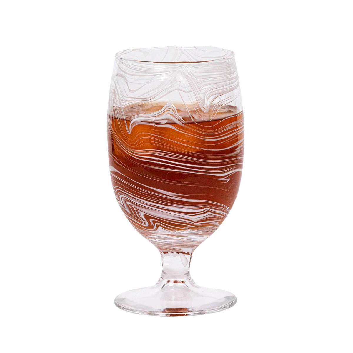 Like swirling water and the decorative pages of Florentine leather-bound books, this marbled wine glass adds an eclectic splash to your everyday table with its captivating motif in soft sea glass hues of white, blue, and green for a joyful pop of color. These chic vessels add a super stylish layer to cocktail hour and place settings - the abstract pattern mixes beautifully with everything.