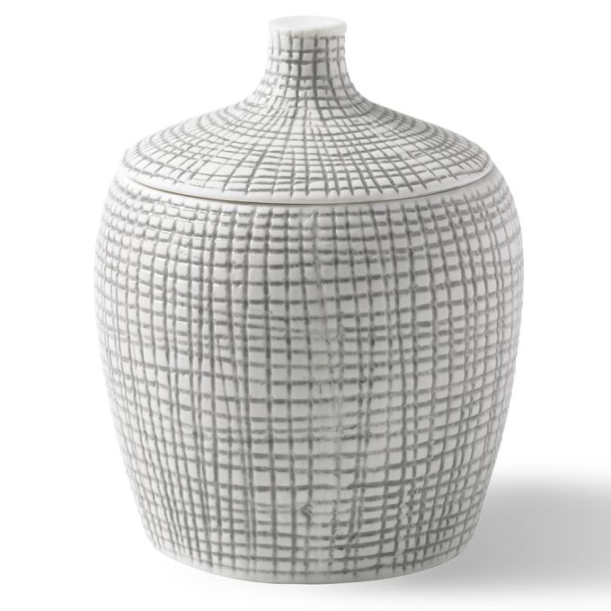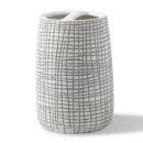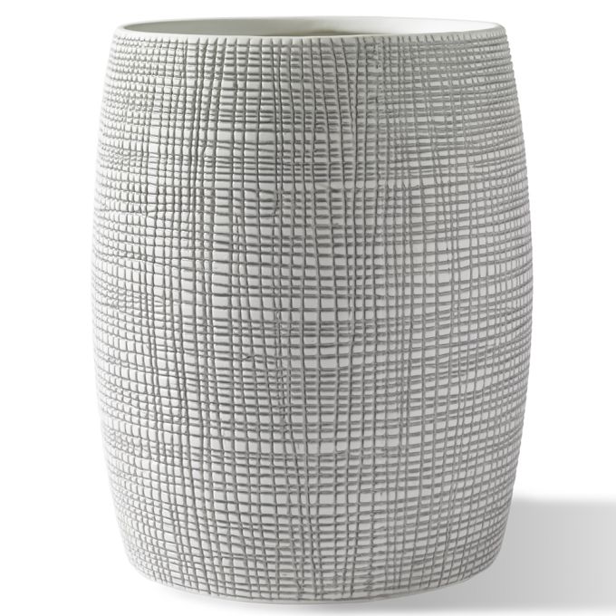 Crafted from embossed porcelain and inspired to reflect woven raffia palms, this accessory set adds a feeling of natural refinement to the bath.