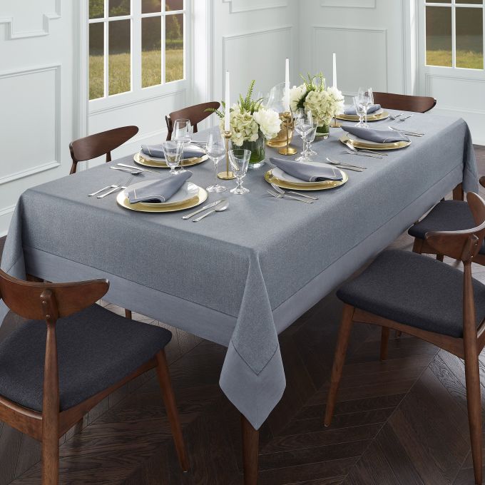 Anticipating the bright, effervescent mood of the holidays, we designed our Reece tablecloth to set the perfect tone for every celebration: a solid-colored linen border juxtaposed with Golden or Silver metallic woven yarns—evoking a shimmering tabletop that catches the light.