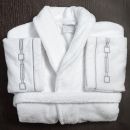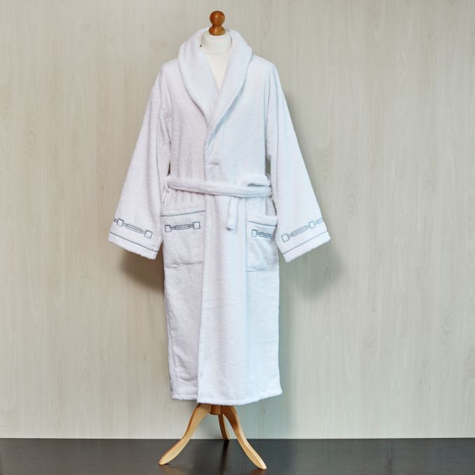 The Retrò bathrobe is embellished by a stunning pattern inspired by the design of ancient jewelry. The Retrò pattern is embroidered on the cuffs and on the pockets giving a unique touch of elegance to the bathrobe. Let yourself be embraced by the comfort of Signoria extra-long-staple Long-staple Combed Cotton. A wide range of embroidery colors is available.