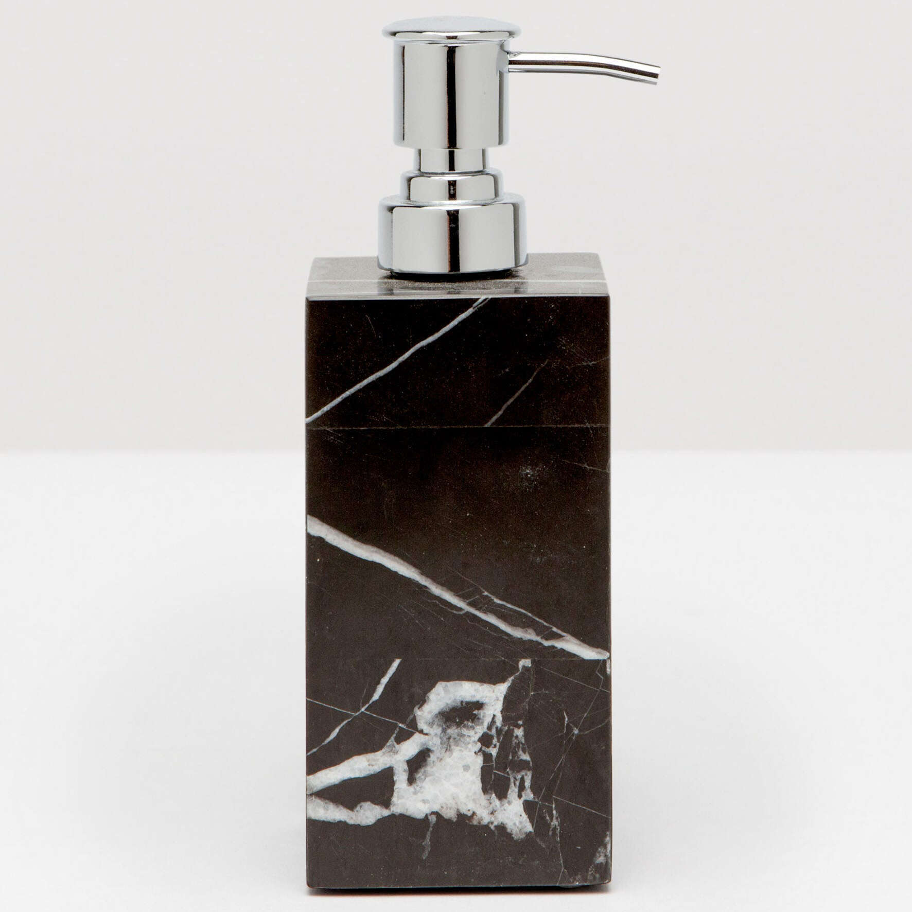 A luxurious bath collection of velvety, white-veined black marble goes next level with a handsome brass trim.