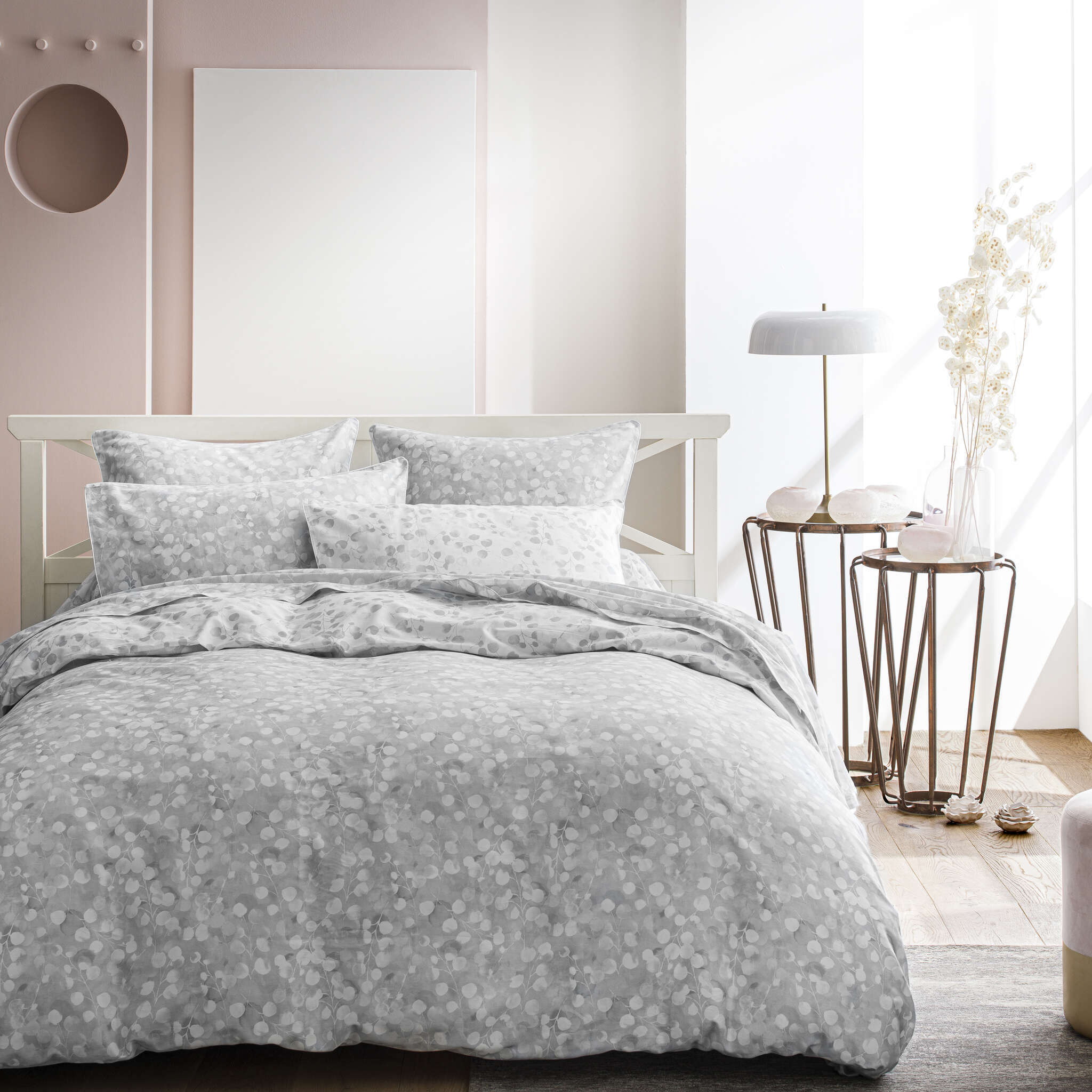 The softness and watercolour transparency of the Honesty flower is played out on a delicate superposition of light and shadow in blue tans. Formal, airy, evanescent lightness.