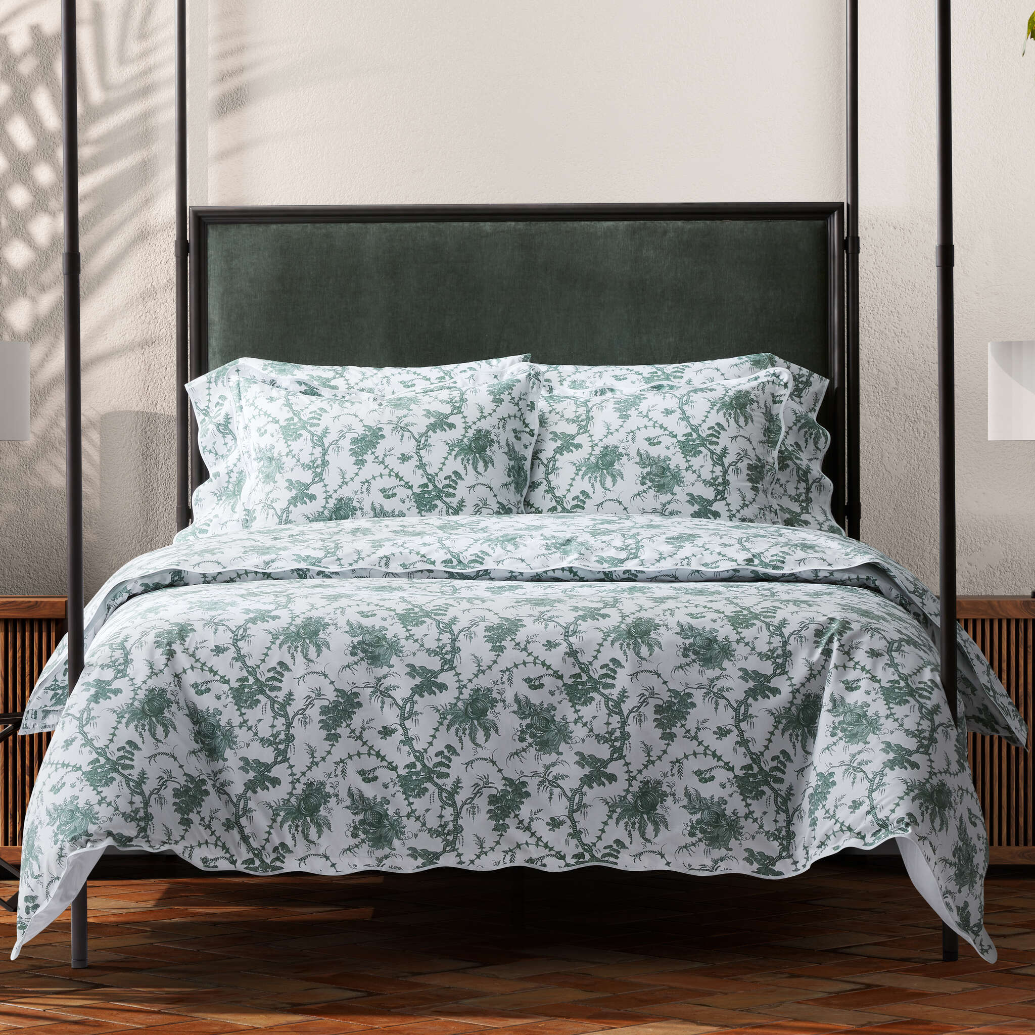 Here to bring some toile de jouy to your bed, Schumacher's San Cristobal will guarantee the sweetest of dreams. Though a faithful reproduction of an 18th-century document, this pattern has remarkably modern sensibility. We’ve paired it with our lightweight, super-luxe 500 thread count Luca Egyptian cotton percale and finished it with a subtle scalloped taped edge.