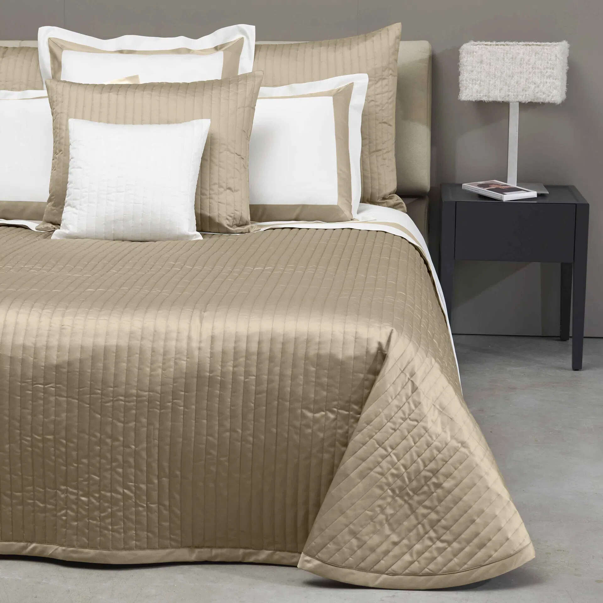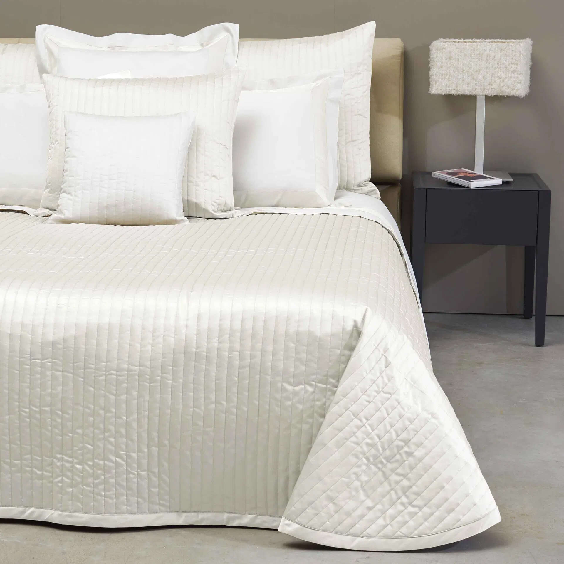Quilted Coverlet: solid sateen with a channel quilted design and our signature rounded corners; reverses to plain cotton.