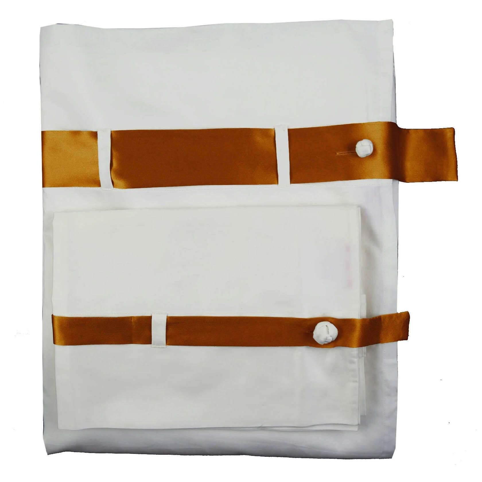 The top sheet and pillowcases are constructed with loops to insert removable silk bands in your choice of color. A great way to change the look of your bed without changing your sheets.