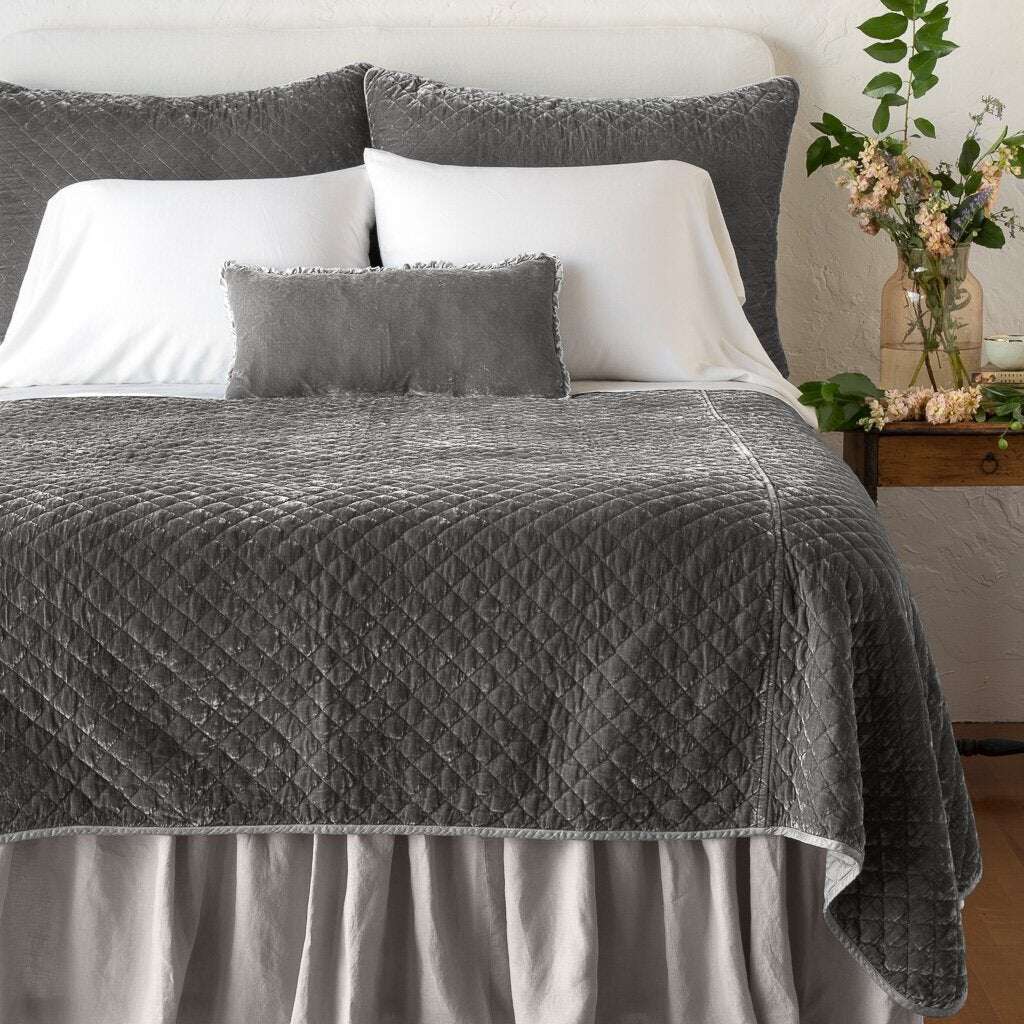 Our Silk Velvet Quilted enchants the senses with its plush hand and luminous color. Backed and edged in satin, this utterly romantic garment dyed coverlet drapes dreamily on any bedframe in your home, a deliciously opulent layer to dream beneath.