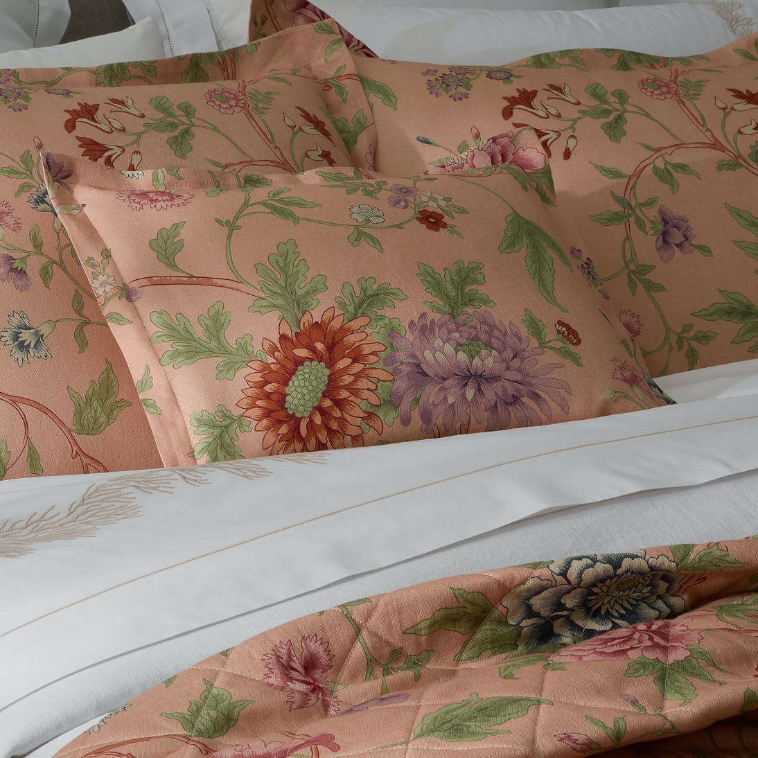 Breathtakingly vibrant, Simone's floral print is inspired by a 19th century English fabric remnant hand-selected from Schumacher's vast archive. Translated to our ultra soft Roman linen, the print takes on a multi-dimensional effect full of rich texture and shadow—perfect for top of bed styling or mixed in with our range of percales and embroideries.