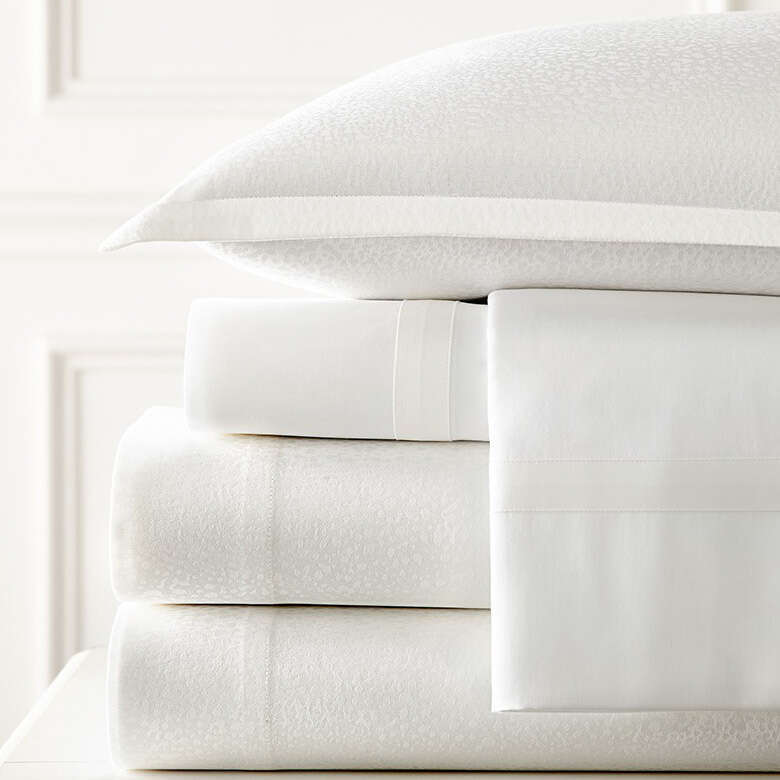 Our finest sheeting cloths woven in Italy are 100% Long Staple Cotton, and manufactured in our own workrooms in Virginia, where careful attention to every detail is paramount. Stockholm Jacquard in three colors, Pearl, Sand and Sky.