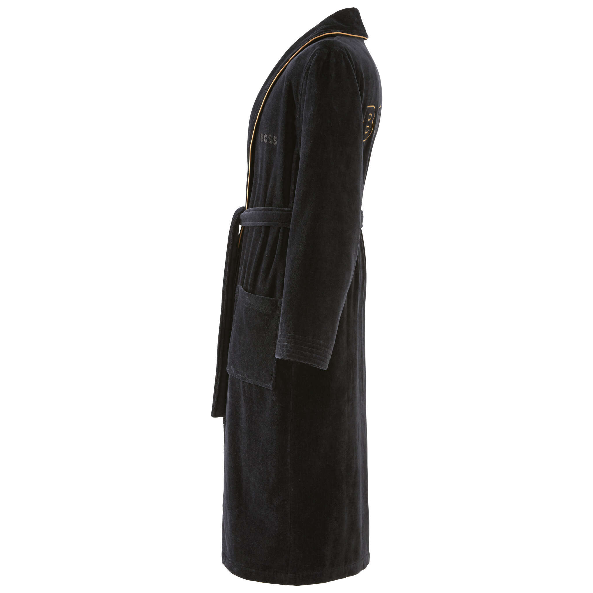 Centred around BOSS Home's modernised logo, the Tiago bath robe features the brand's signature embroidered across the back of this men's design. Made with sumptuously plush cotton velvet, the robe is equipped with stately shawl collar and a matching belt to tie at the waist. Fitted with a pair of patch pockets at the hips, the design is outlined with contrasting piped trim along the collar and front opening.