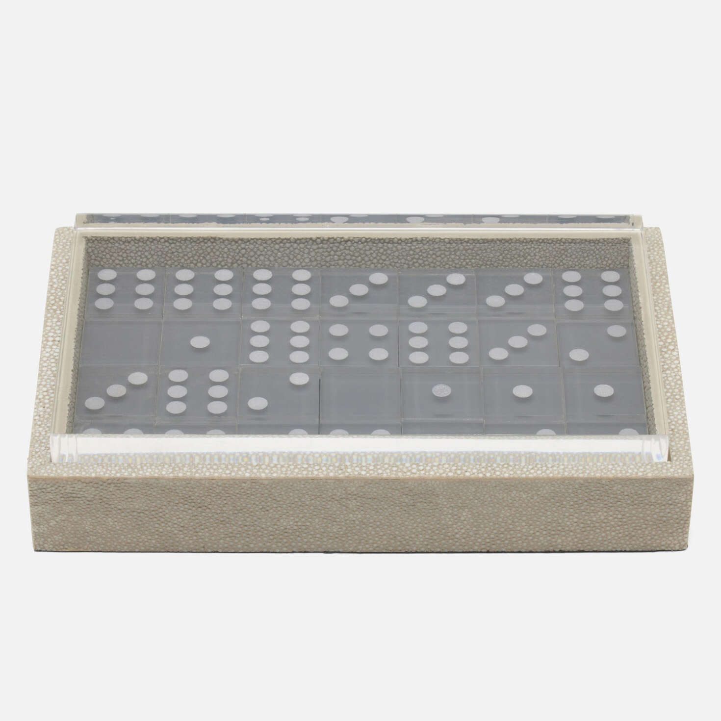Faux shagreen domino set with resin pieces and a clear acrylic top.