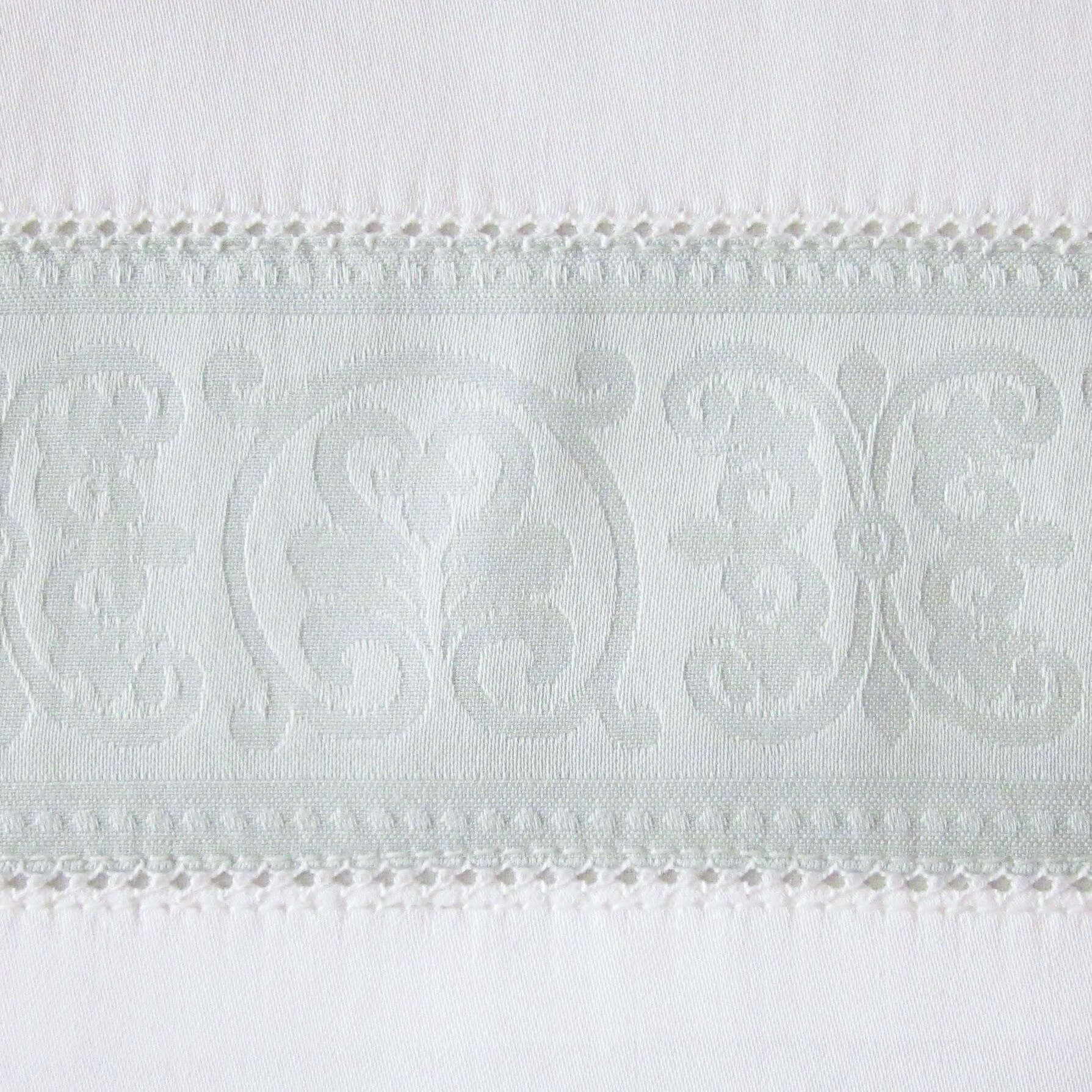 Venice Flat Sheets, Pillowcases are designed with a solid sateen body and jacquard inset along the Euro return, bordered by a tone-on-tone, hand-guided hemstitch.