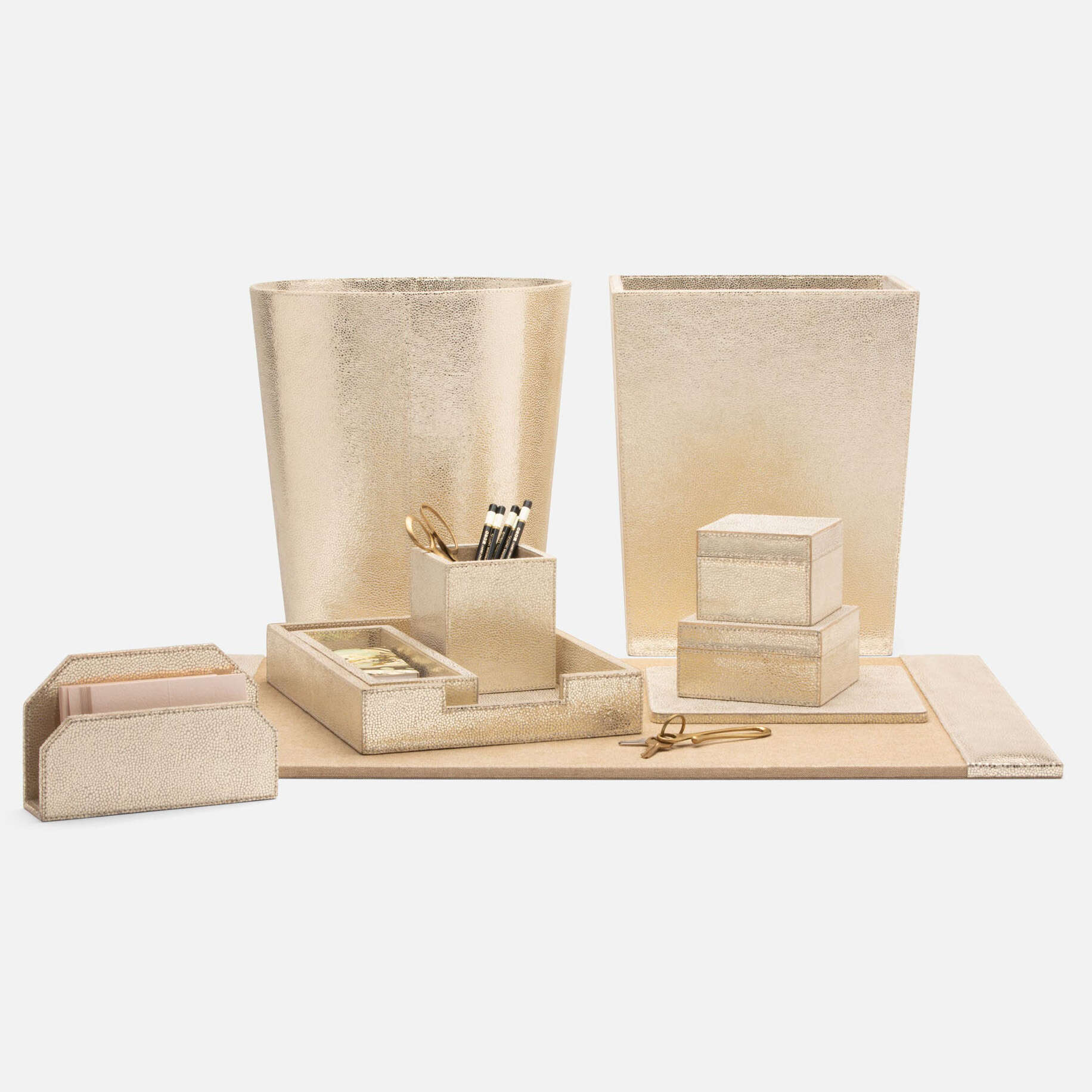 Spotted Gold Foil on full-grain leather delivers a desk set that will dazzle any den or awe any office.