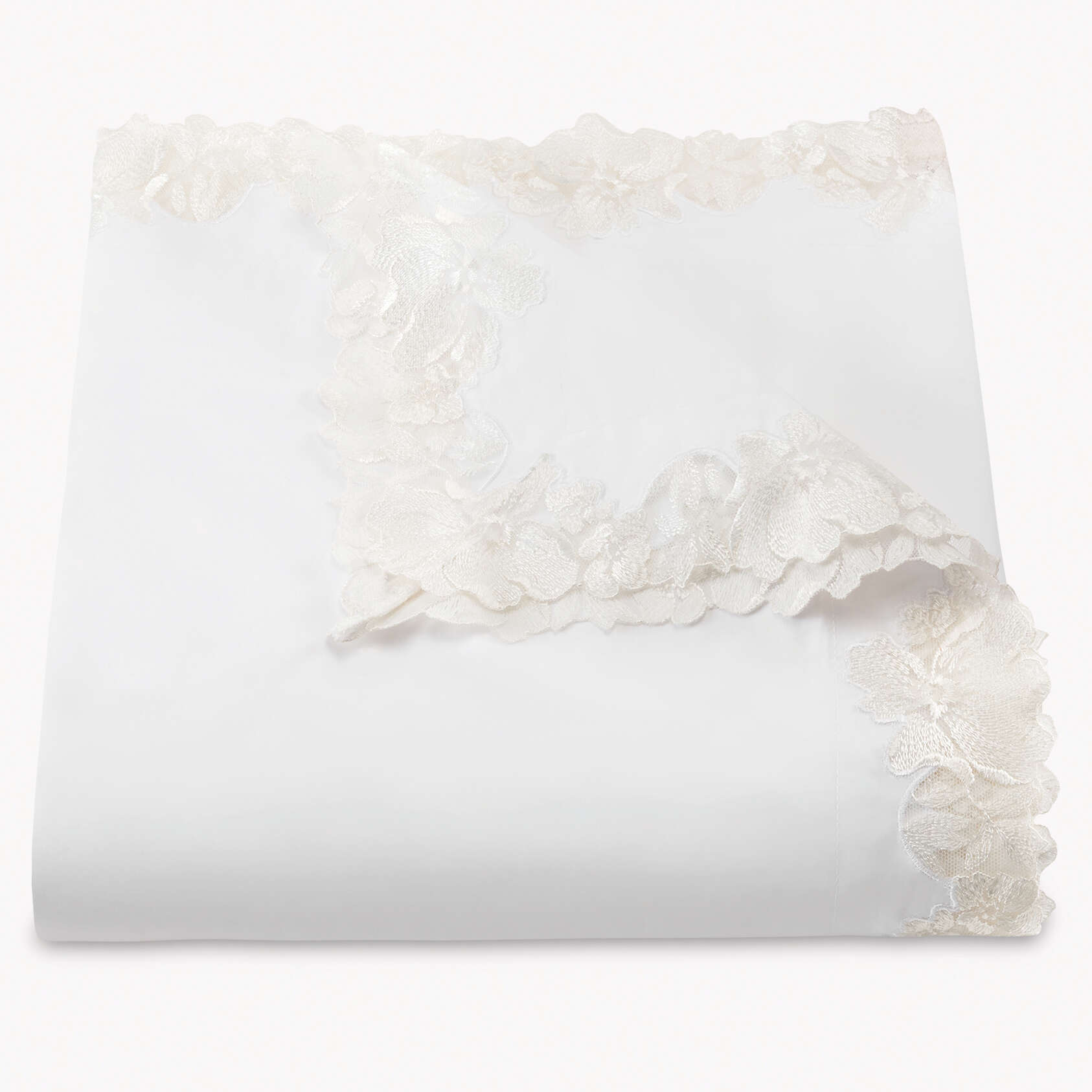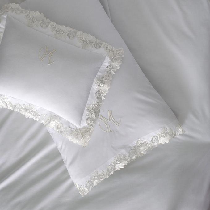 Virginia looks back to our early years importing lace, a special nod to Matouk's 90th anniversary. For this couture collection, an archive-inspired Swiss lace is cut and placed by hand on our supremely luxurious, 1000 thread count Gatsby Giza Egyptian cotton percale.