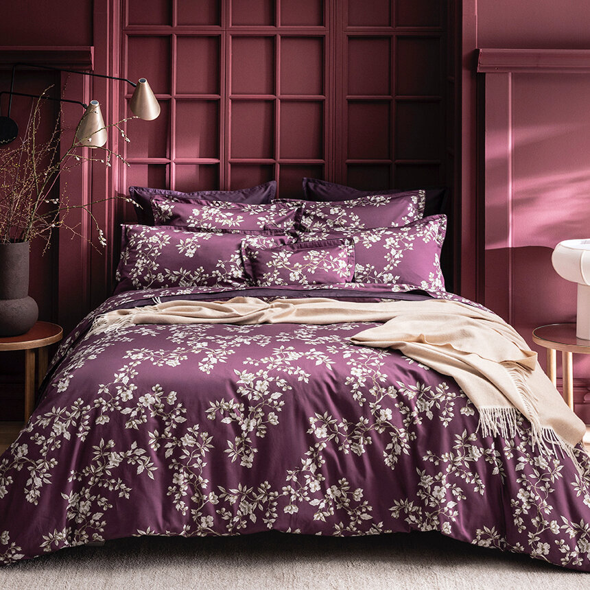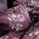 The Vivienne bedding set revisits the ornamental spirit with boldness and modernity. The Vivienne bedding set is inspired by 19th-century decorative garlands, reinterpreted with great graphic freedom. The pattern, treated in a soft and sinuous engraving, stands out against an intense monochrome background, in two variations: Ginger, a warm orange ochre, or Pansy, a luminous magenta purple. The flat color, rare in digital printing, creates a strong and contemporary atmosphere. The plain reverse tempers the intensity, while the tone-on-tone piping elegantly frames the contours.