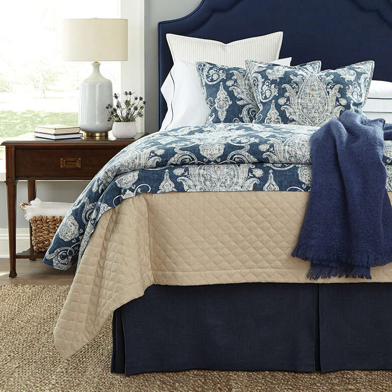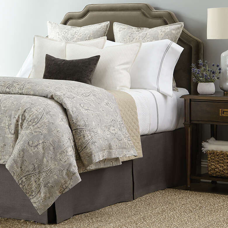 Bed Skirt: Wentworth Tailored 5 Pleat, Standard 15" Drop - No Decking, Band w/Mattress Pins to attach to Box Spring.