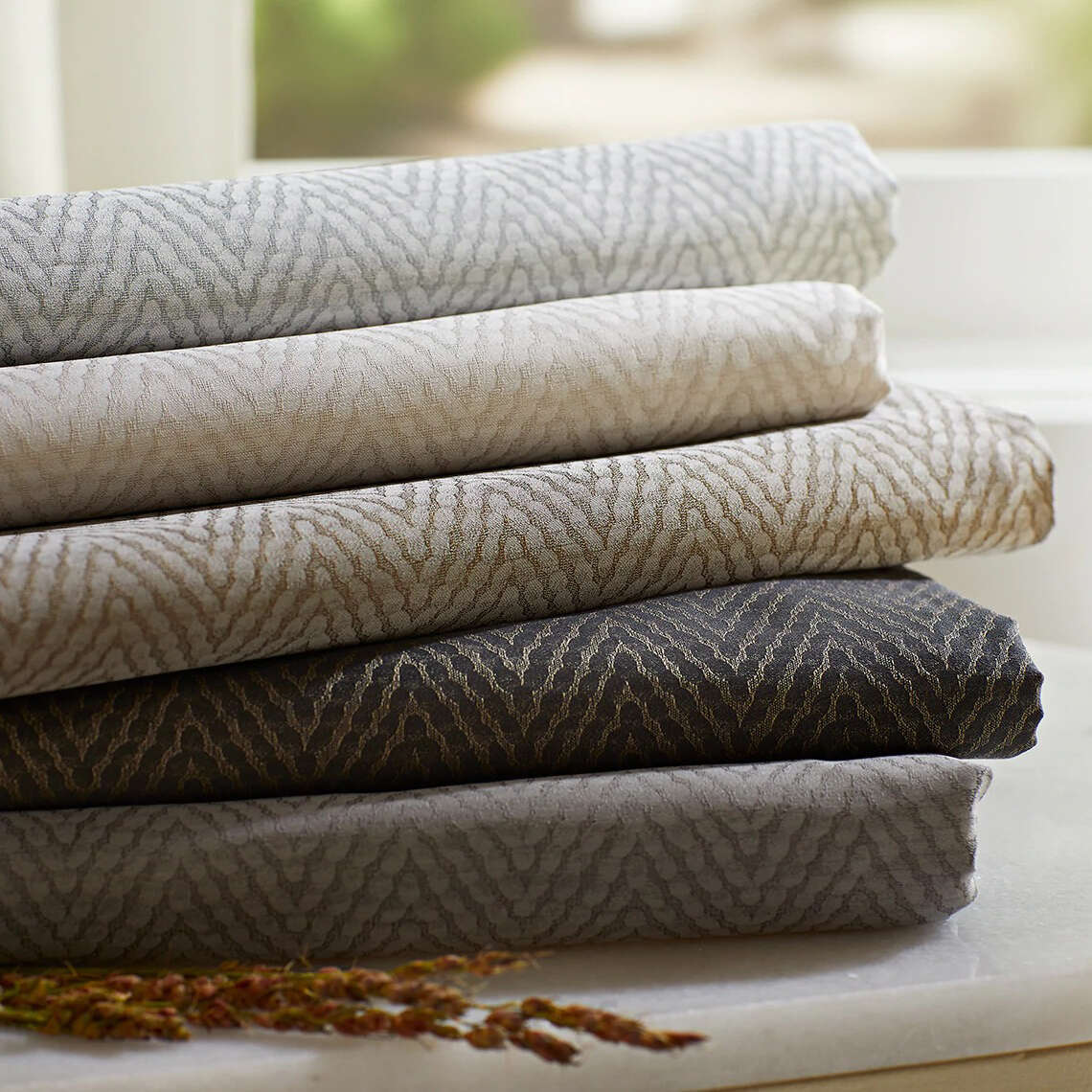 This large scale herringbone has a modern flair with its textured, jacquard chevron repeat.
