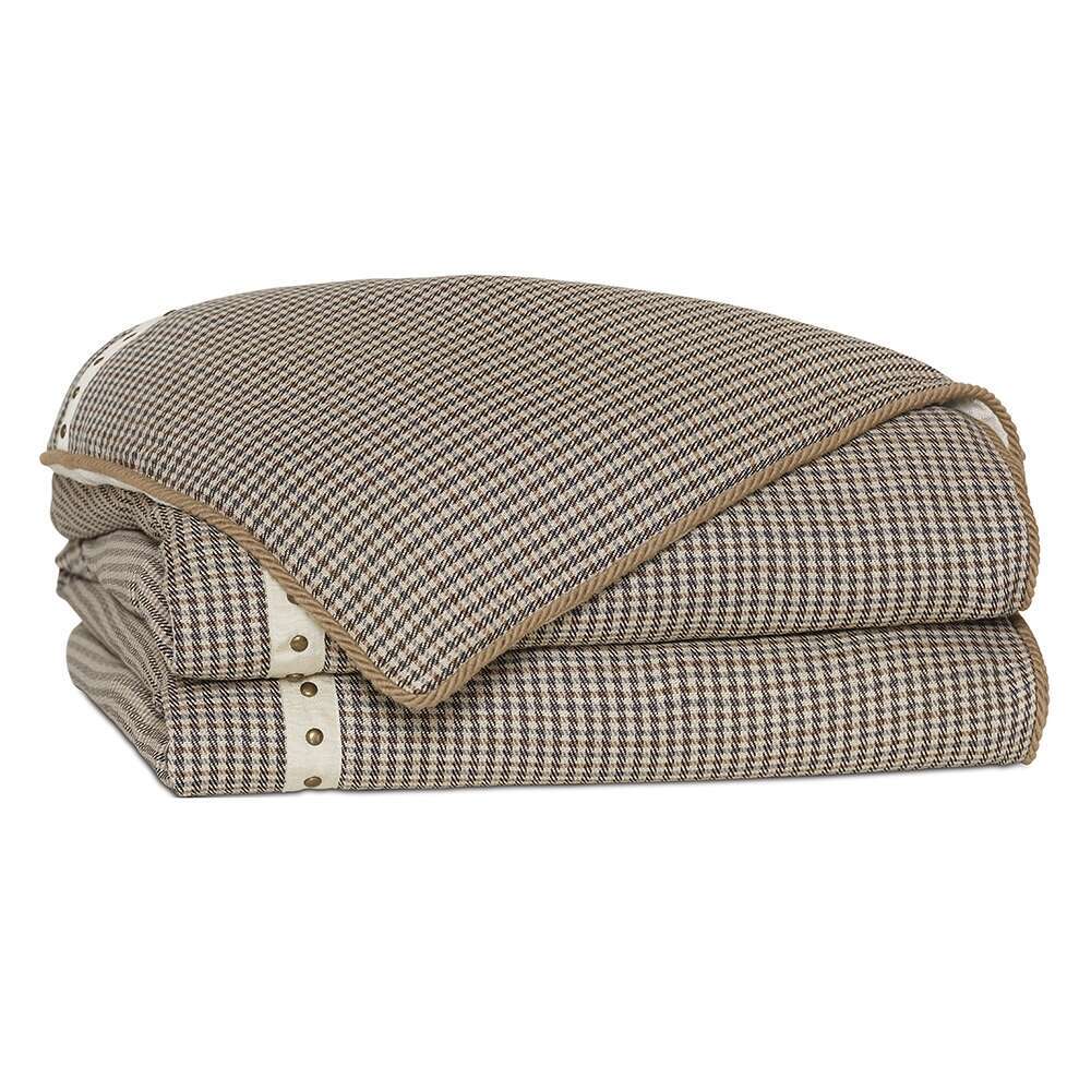 Duvet Cover: Decorative houndstooth fabric on face. Nailhead gimp trim on seams. Cord trim edge finishing. Ties inside all four corners for easy comforter attachment.