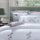 Sham: Mitered flange on sham ; French-flap closure, embroidery placed in one corner on std and king sham; in the center on boudoir sham; on two opposite corners on eurosham + 4 sided contrasting color inset cotton sateen band.