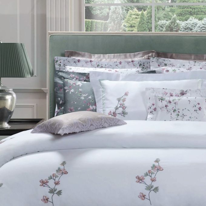 Duvet Cover: Knife-hedge and hidden-button closures. U-shaped + not linked embroidery and U-shaped inset cotton sateen band placed closed to the outside edge.