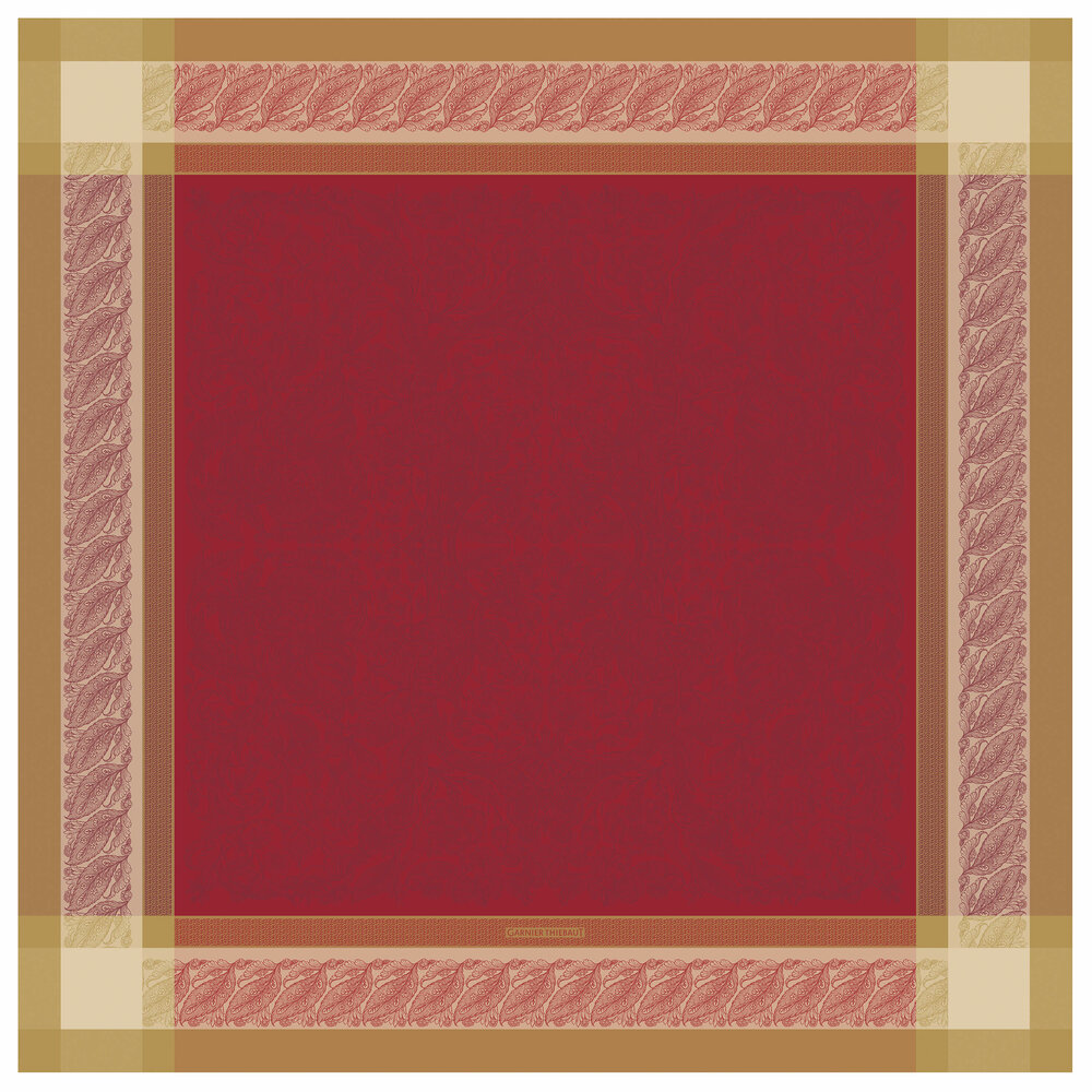 The Alexandria Ruby Tablecloth is woven in France from 100% extra-long staple cotton and finished with Green Sweet stain-resistant treatment that preserves the fabric's natural softness while helping to guard against spills. Inspired by the elegance of a French chateau, its ruby red jacquard design is framed with a refined border in gold and white, where each thread is carefully blended to create depth and richness. A timeless piece that highlights the artistry of French weaving, it brings classic luxury to any table.