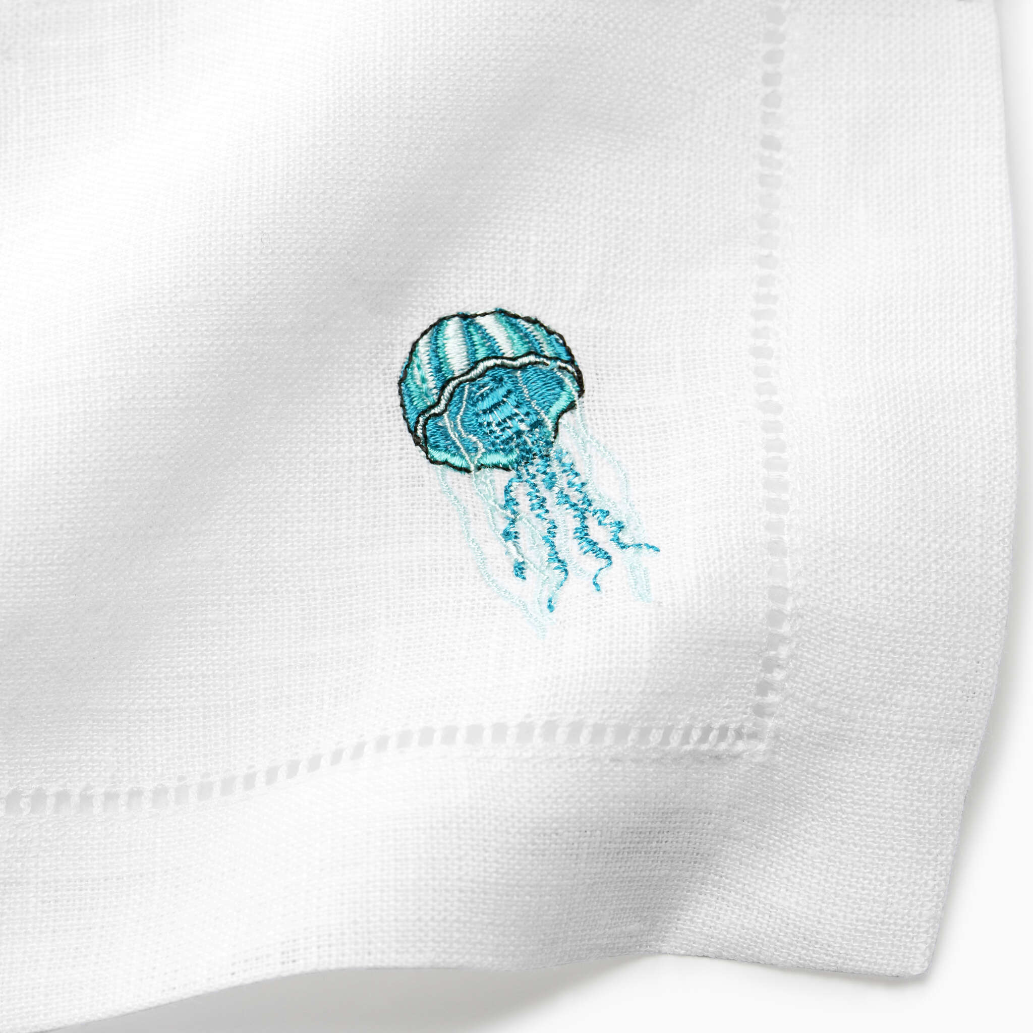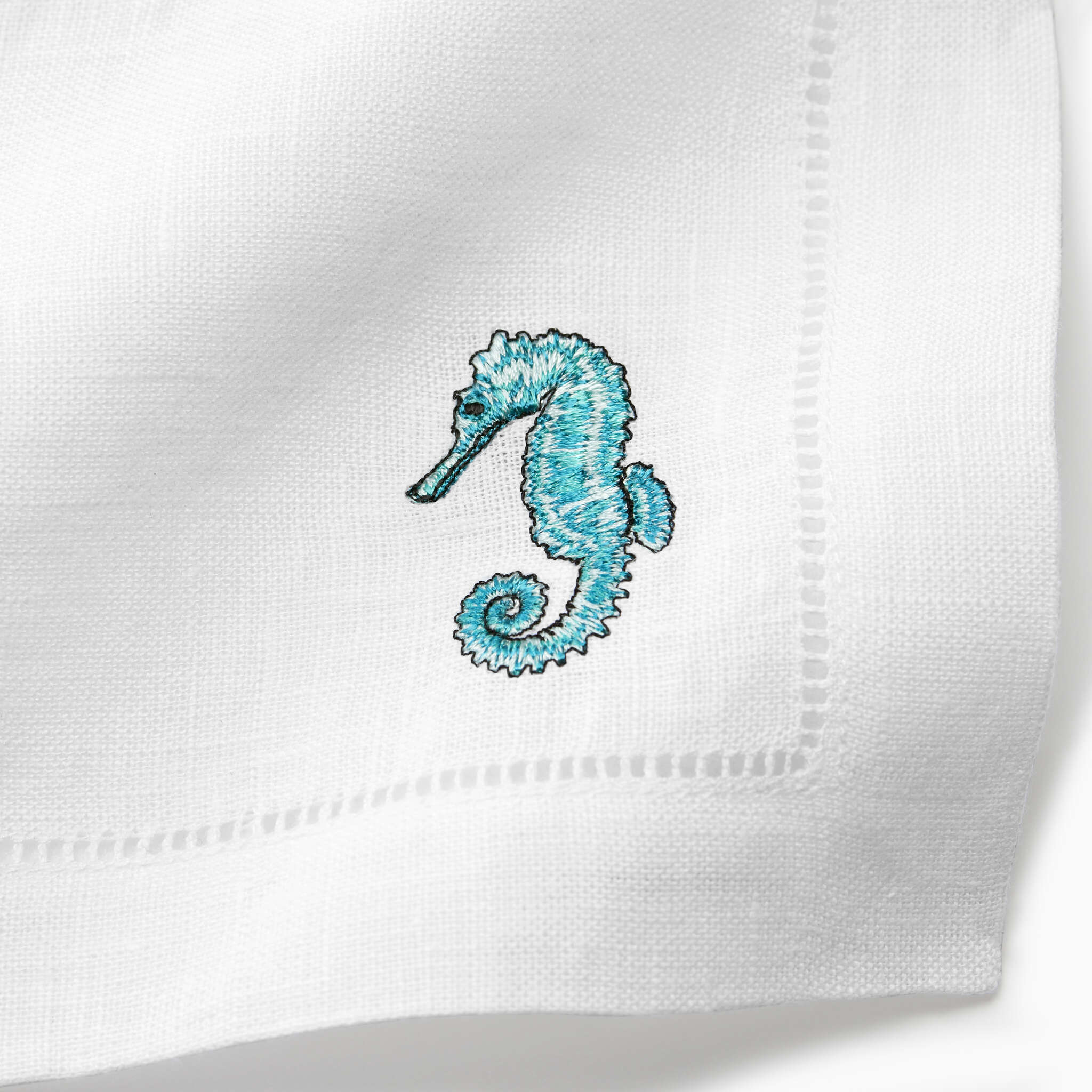 Inspired by the marine life found in the idyllic waters of the Tyrrhenian sea in the Amalfi Coast, these whimsical cocktail napkins crafted of pure white hemstitched linen with aqua-hued embroidered sea creatures will bring the beauty and charm of cocktails on the terrace at Le Sirenuse to your home.