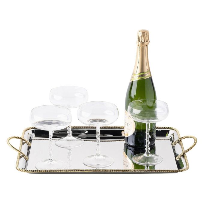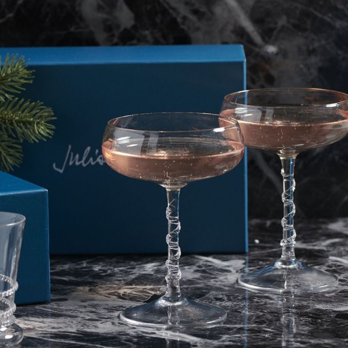 From our Amalia Collection- This set of two traditional coupes, make a celebratory gift. Sip champagne or serve sorbet from the saucer shaped bowl atop a spiraled stem. Our most prolific Bohemian mouth-blown glass collection features an iconic spiral themed design ascending from its base accented with our signature berry.Gift boxed.