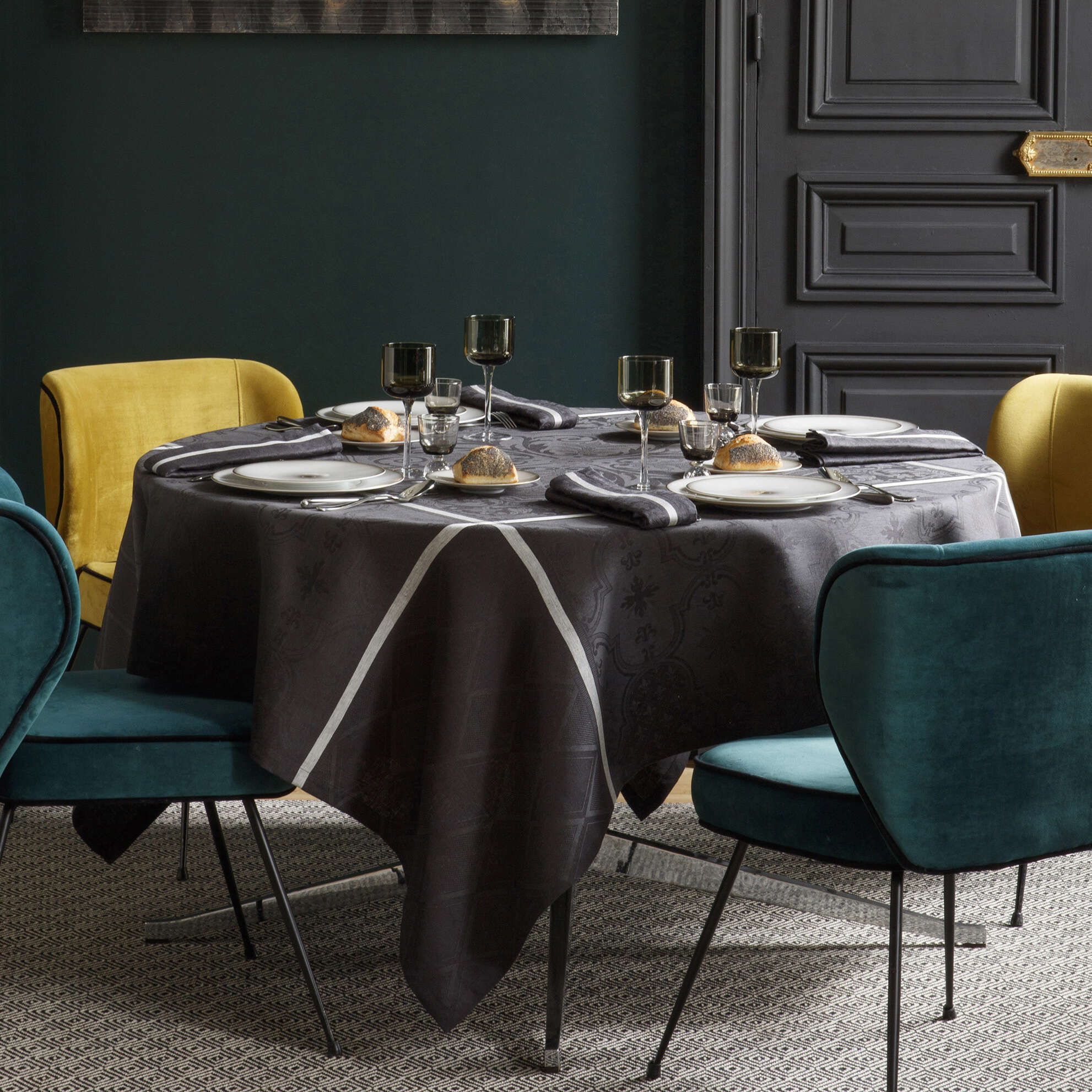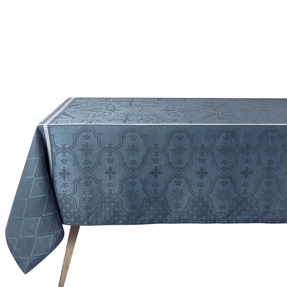 Discover the heart of France's prestigious and elegant heritage with a new color in the Armoiries collection. This sumptuous collection pays tribute to the decorative arts and exceptional craftsmanship of our company. Arabesques, acanthus leaves and fleurs-de-lis gather around a château rosette. Your table will be spectacular and all your guests will be dazzled. The center of the tablecloth, in plain Jacquard, lets you combine timeless or whimsical tableware. The new deep, elegant cerulean blue enhances this emblematic damask range. Finished with mitered corners.