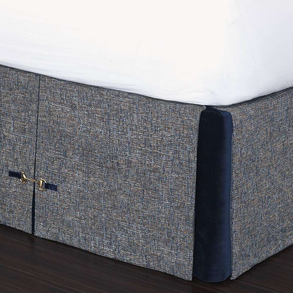 Bed Skirt: Decorative, high quality fabric. Standard 16” drop with 3” decking border. Split corners with kick pleats.