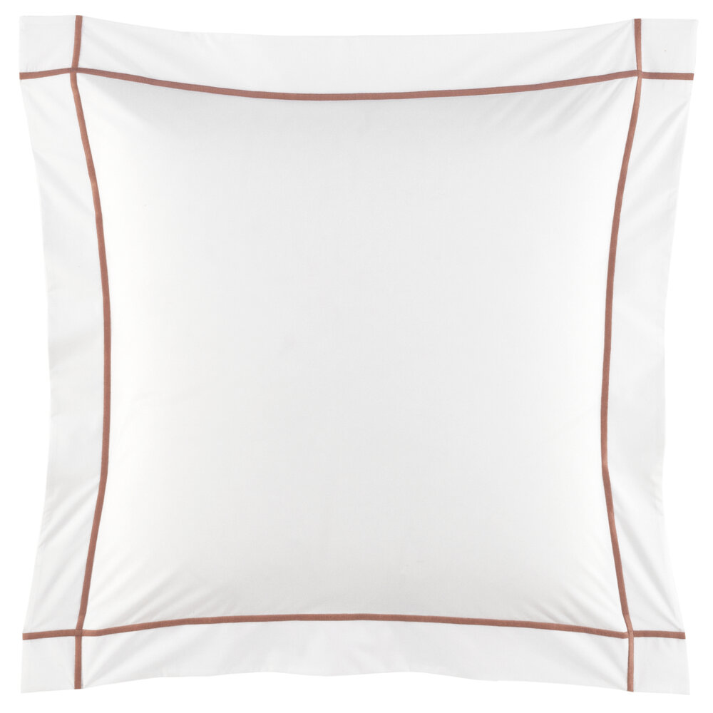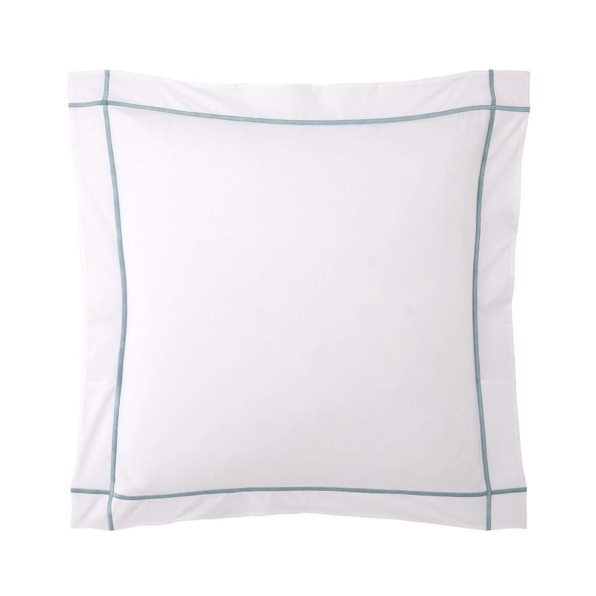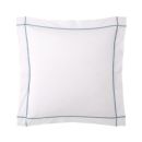 Athéna, goddess of handicraft and weaving, inspires and signs the luxurious identity of this Yves Delorme timeless classic design. A crisp, resistant, sophisticated, and matte finish guarantees the excellent quality of this textile. The pure graphic expression of a colored bourdon stitch frames the flanged pillow cases and duvet cover in an elegant gesture of crossed lines.