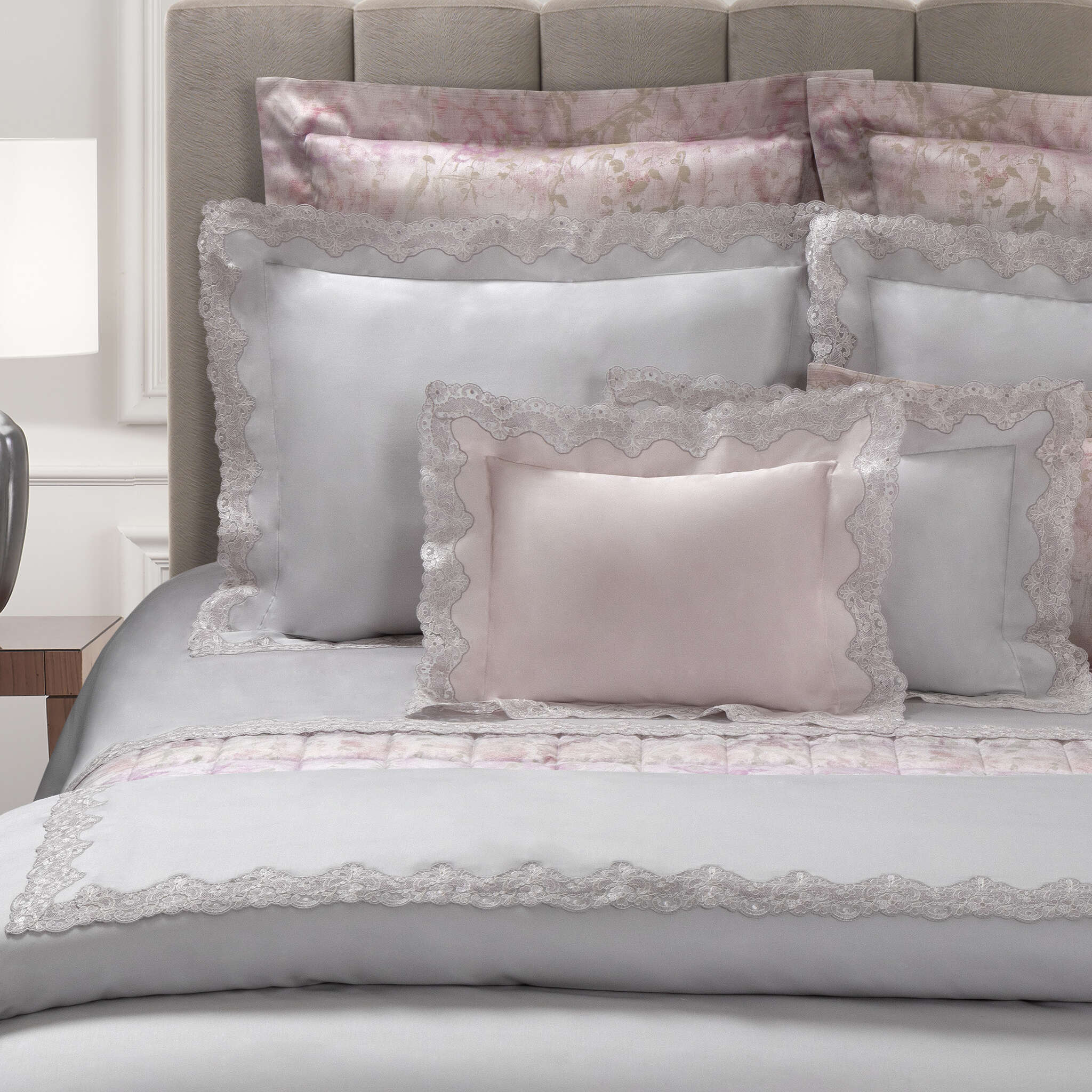The Aura Collection comes exclusively in cotton sateen, a premium, tightly woven fabric with more threads in the warp to give it a particular aesthetic and luminosity. The prints on these precious fabrics best express the various colors, while all the laces light up with snow-white flashes. The absolute elegance of these fabrics is accompanied by snug comfort throughout the year and its excellent durability. Premium quality and an exclusive pattern distinguish the lace used in the Aura Lace Collection. The addition of the highest level of professional craftsmanship transforms every individual element into a masterpiece. Only a skilled artisan’s superiority produces the perfection of stitches hidden in the lace design, complementing it without ever interrupting the visual harmony of the whole.