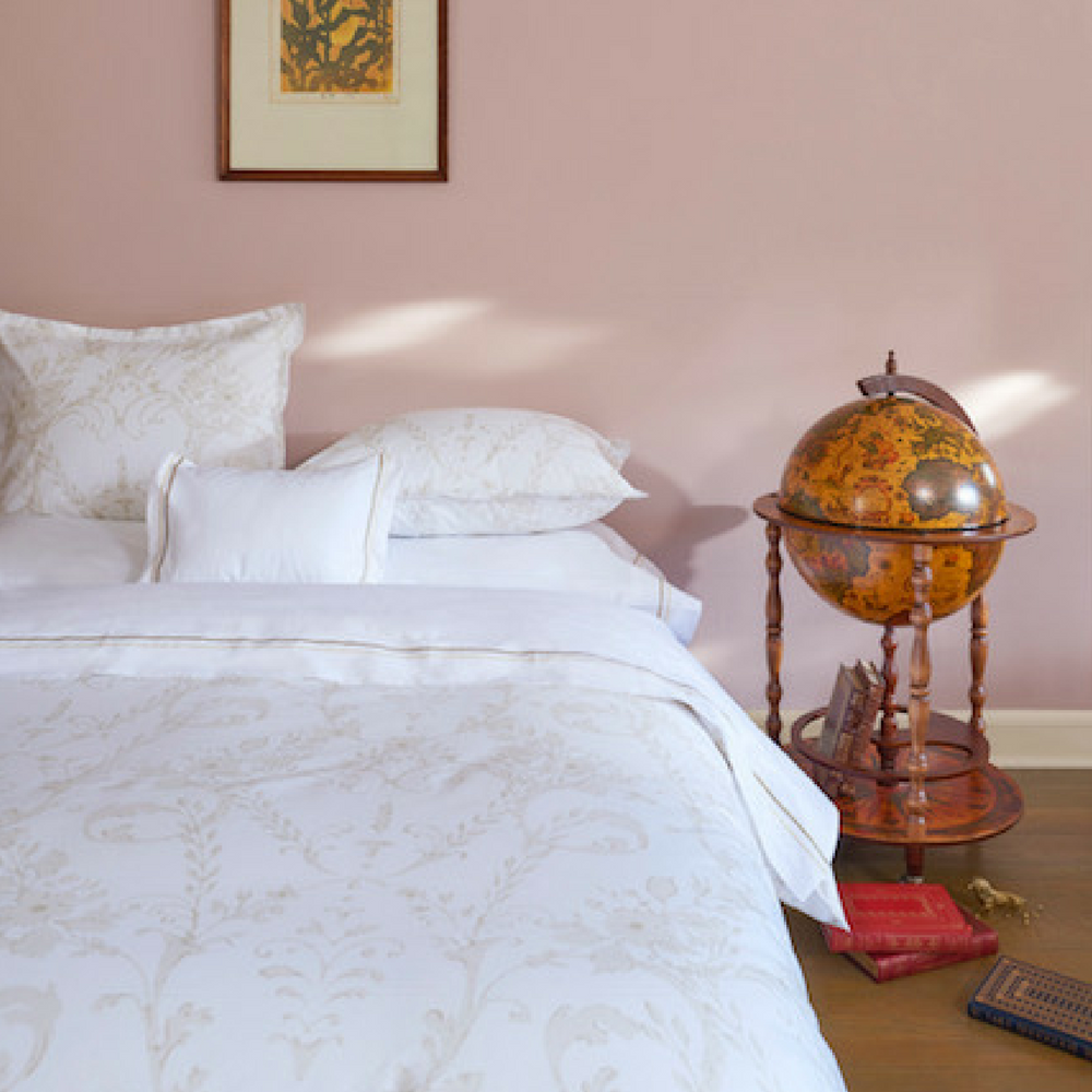 Bedding with a large scale floral pattern in soft and soothing colors, Aurora by Stamattina fine linens, is a stunning focal point on any bed.